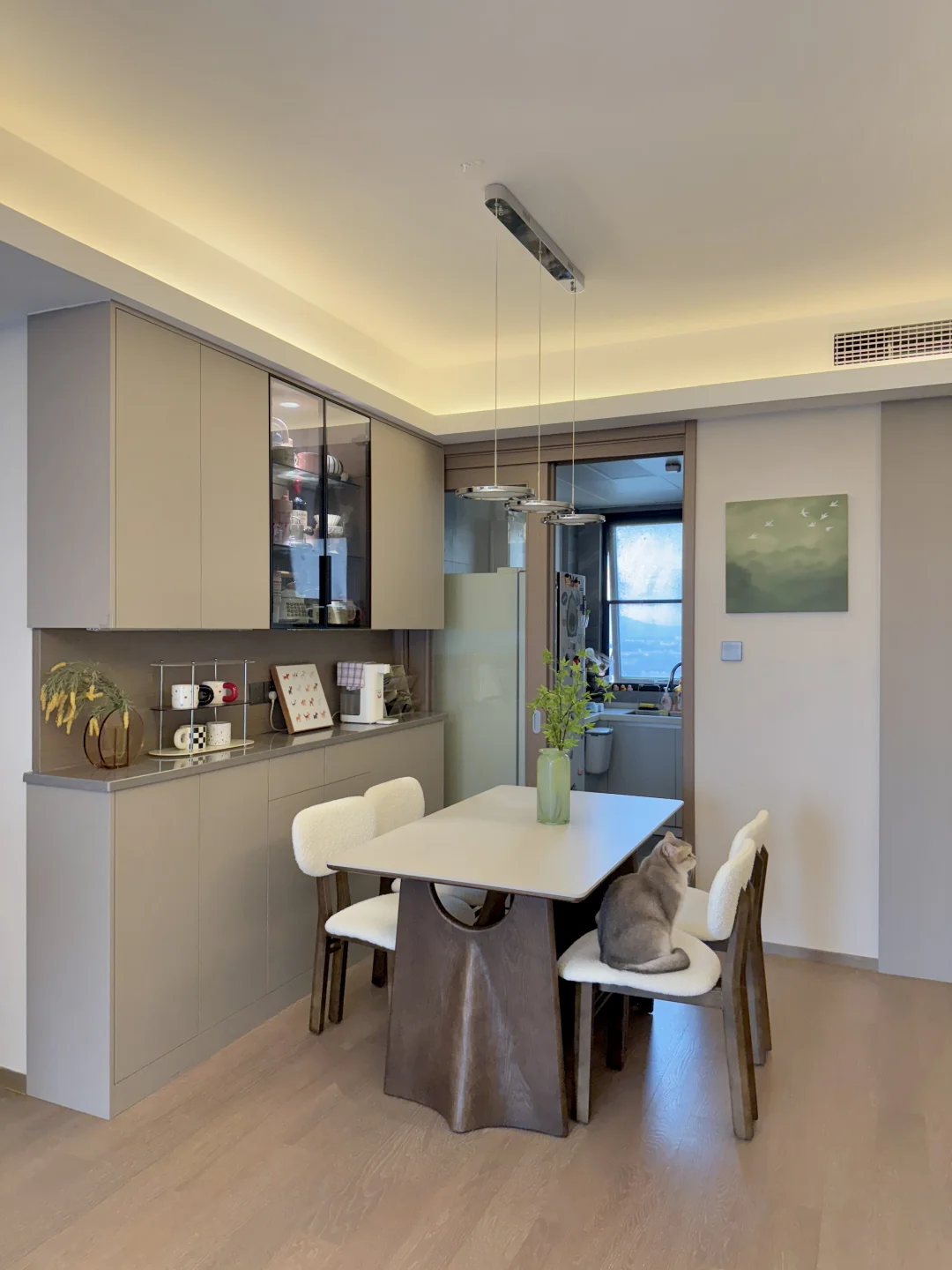 餐厅开间3.6米,背景墙2.24米,上下两层柜子,中间悬空放杯子、饮水器等,上层柜子中间可做两扇透明柜门,显得比较简约高级