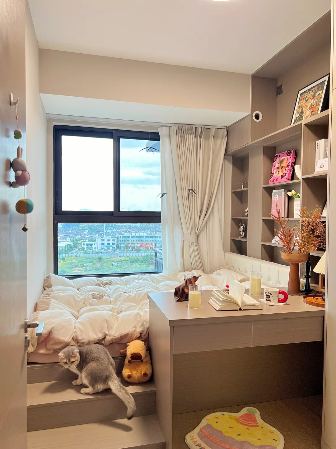 儿童房带飘窗的情况下只有7平方,所以做了可收纳的榻榻米,还有放置书本的架子和学习的小桌子,外加挂衣服、收纳被褥的柜子,尽可能在有限的空间里多做些收纳空间