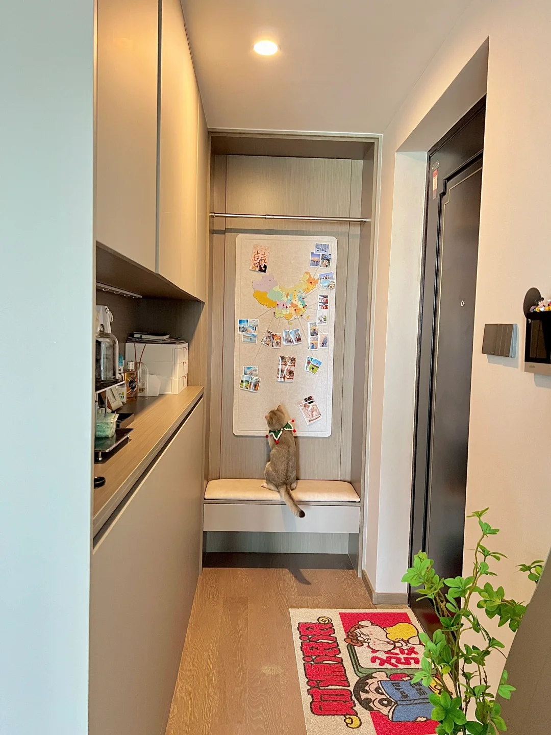 玄关原来宽度是1.26米,柜子做的0.36米,上下两层,对于一家三口来说鞋子收纳绰绰有余,还在玄关做了脚凳,方便换鞋