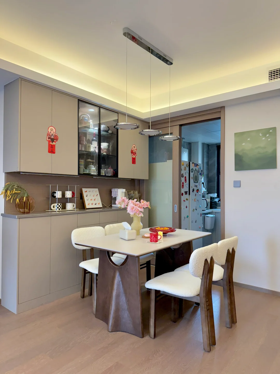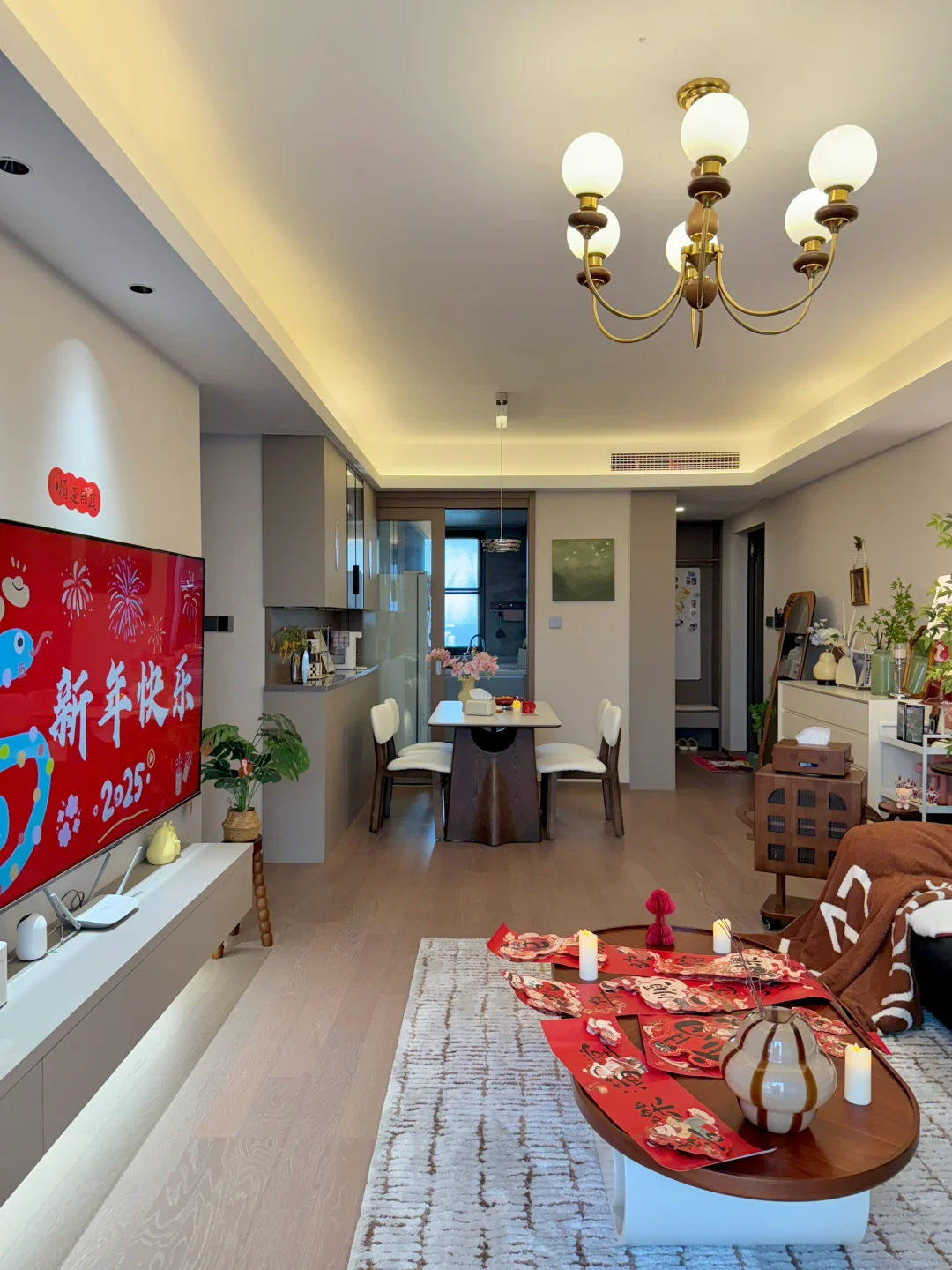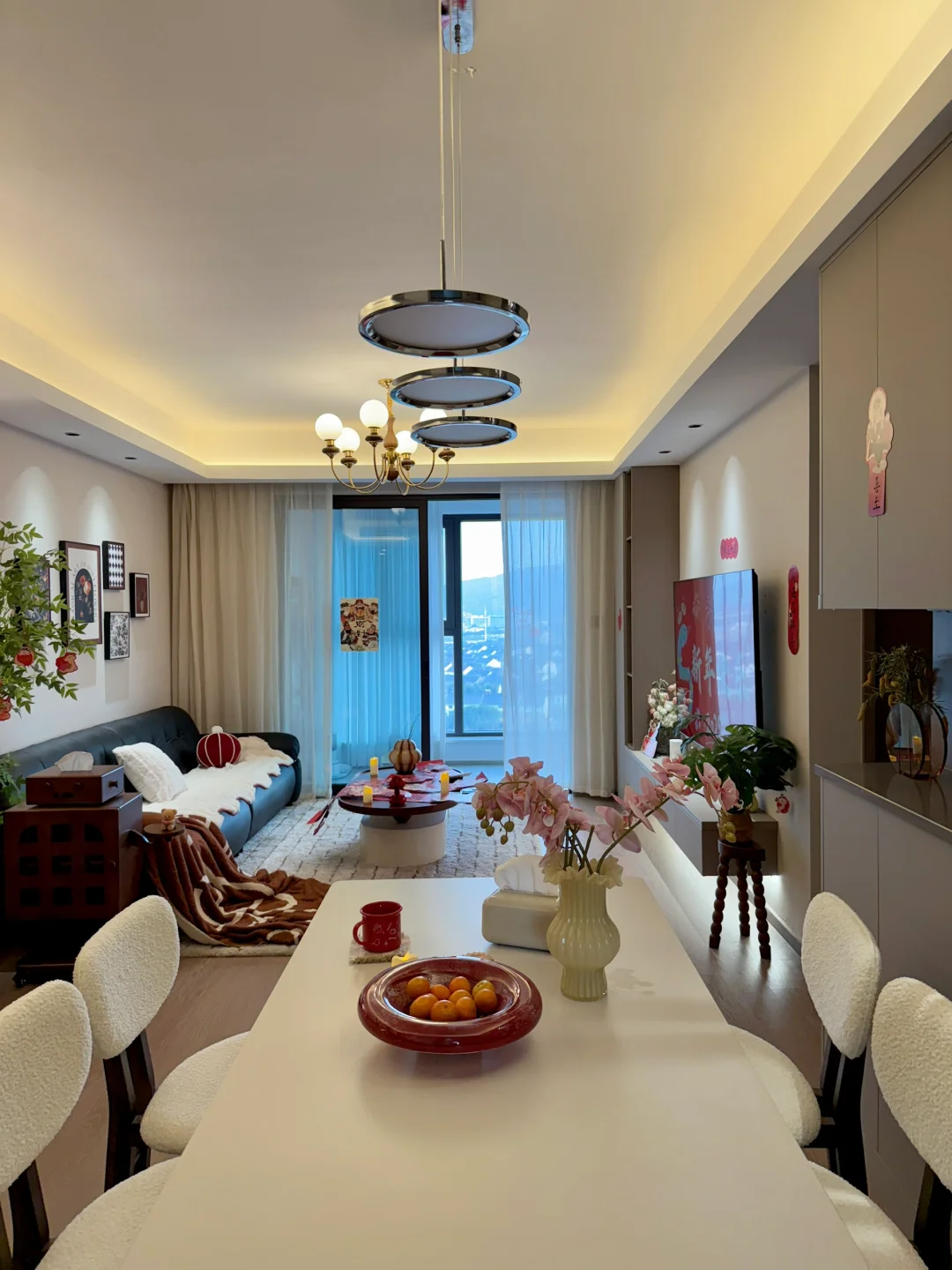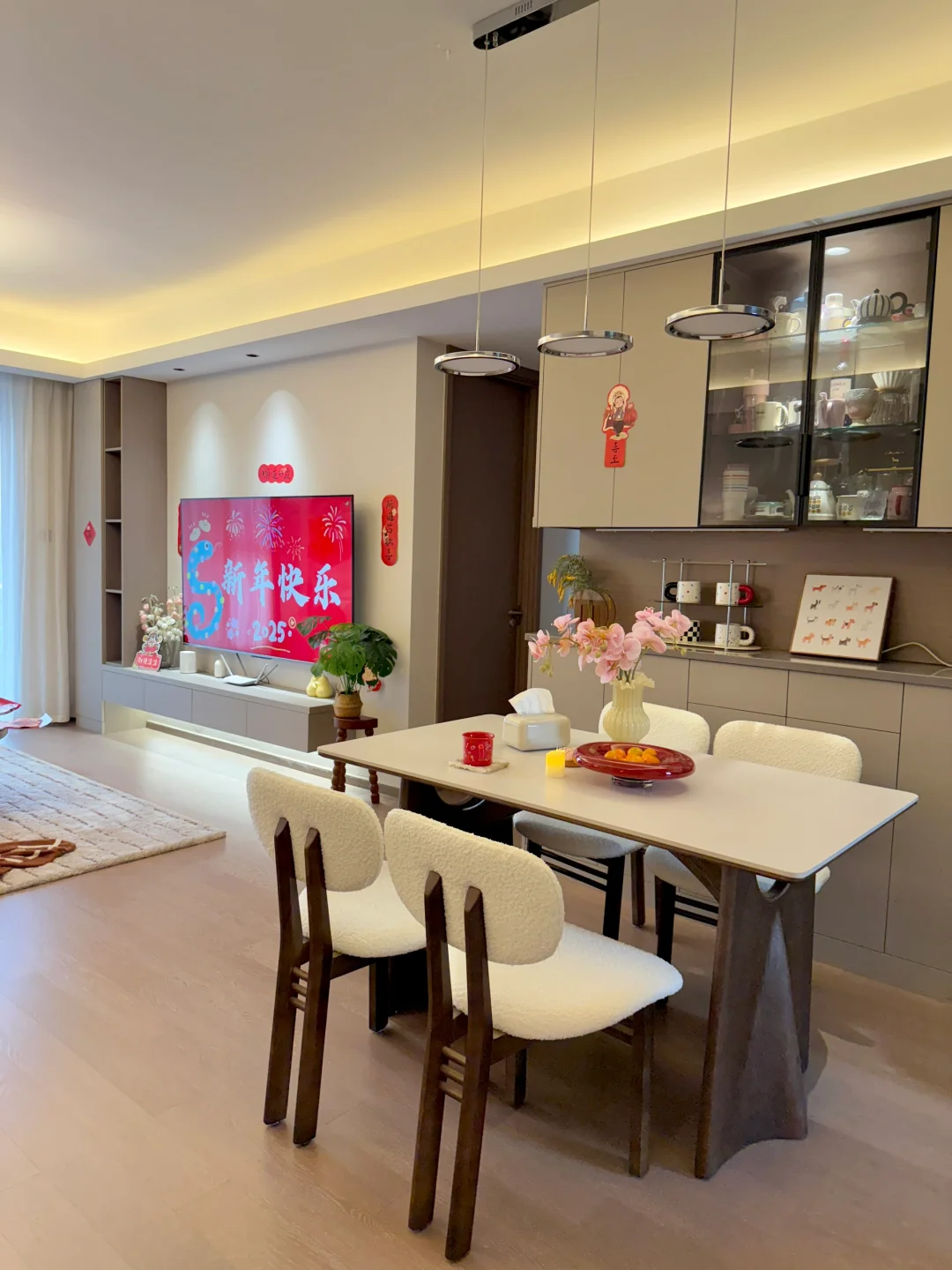 我家精装房128平套内100平 硬装没做什么复杂造型🥹 全靠5W的软装拼凑温馨感小家 复古魔豆吊灯搭配岩板餐桌🟤⚫️ 组成了现在这样一个简简单单的家 虽然不够完美,但有家了💕