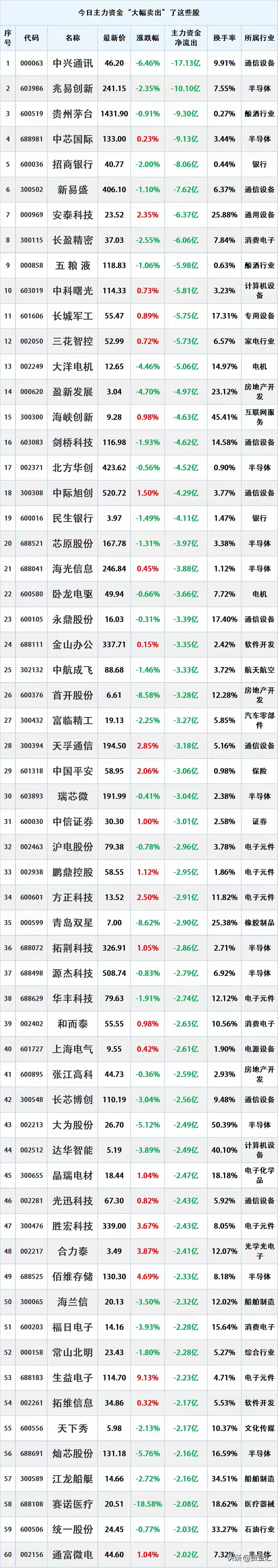 尾盘资金出逃,10月29日主力资金大幅流出的股票名单。 资金流出是指在一定时期内(如一天、一周等),主动卖出某只股票的资金量大于主动买入该股票的资金量。主动卖出是指投资者以买方的报价直接成交,显示出投资者对该股票的消极持有或抛售意愿。