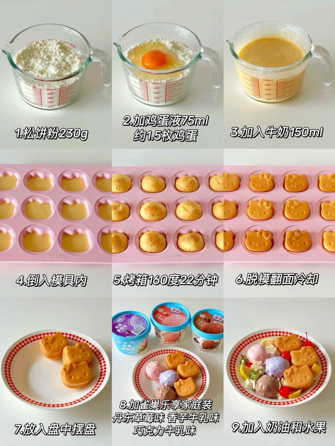 1️⃣松饼粉、牛奶和鸡蛋液混合均匀后倒入kitty烤盘中,面糊可做12个。