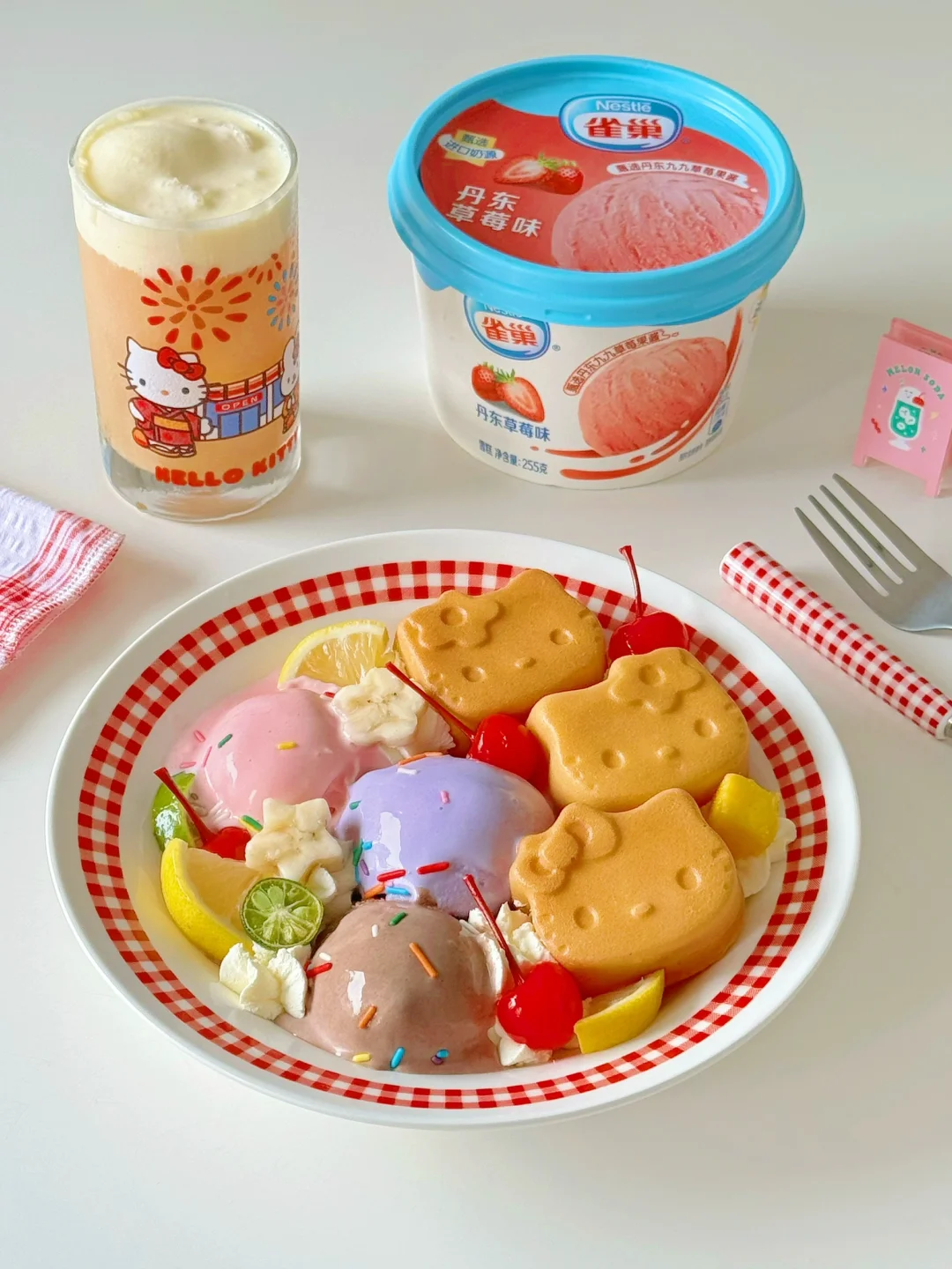 3️⃣取出三个口味的雀巢乐享家庭装室温稍微软化一点后,挖出冰淇淋球,再挤上奶油放入水果装饰。