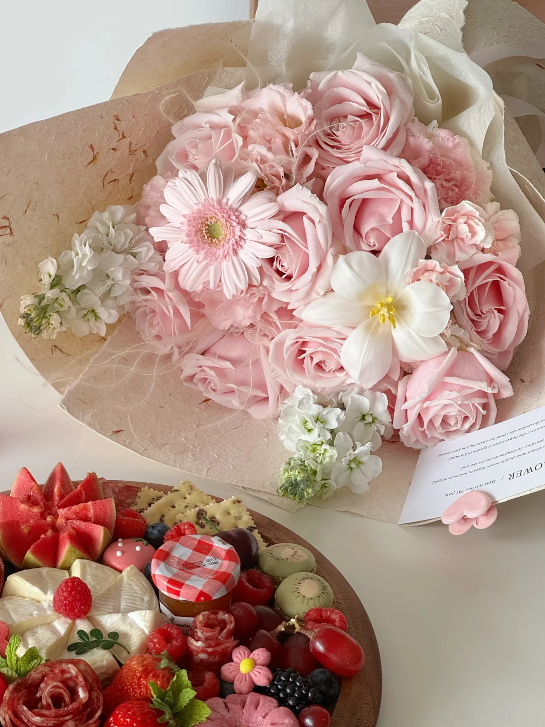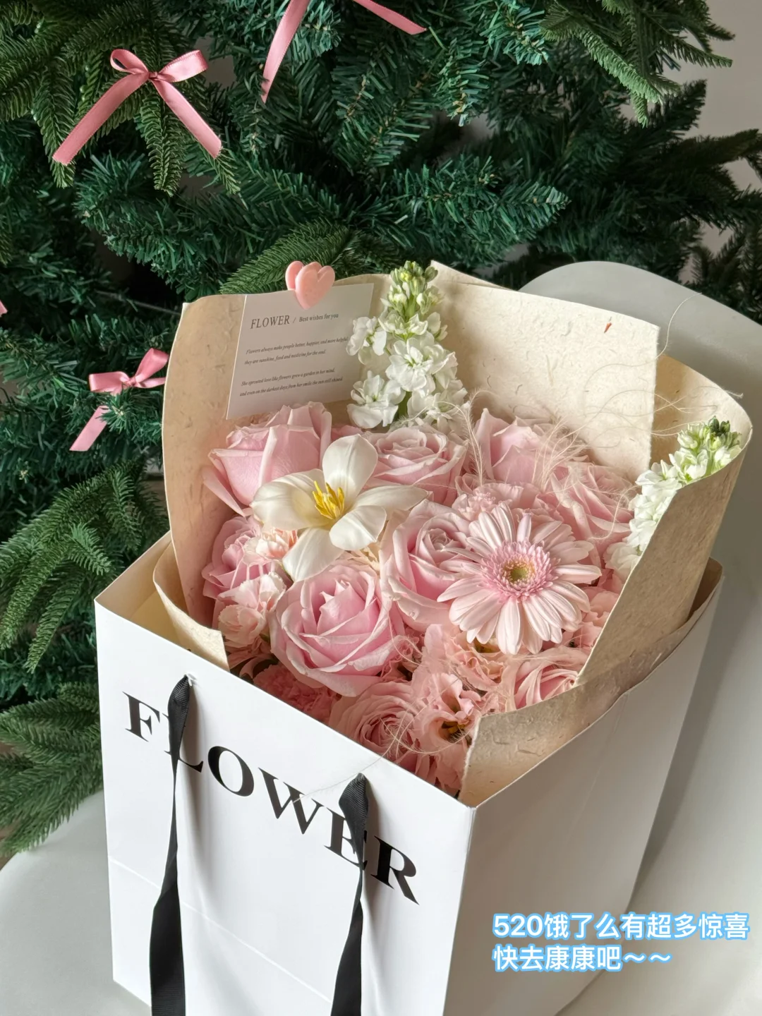 再买了一束粉嫩嫩的520鲜花🌷餐桌上的节日氛围感瞬间拉满~