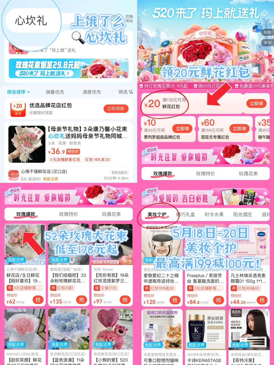 5.15-5.20在饿了么搜索🔍心坎礼,可以领20元的鲜花红包🧧