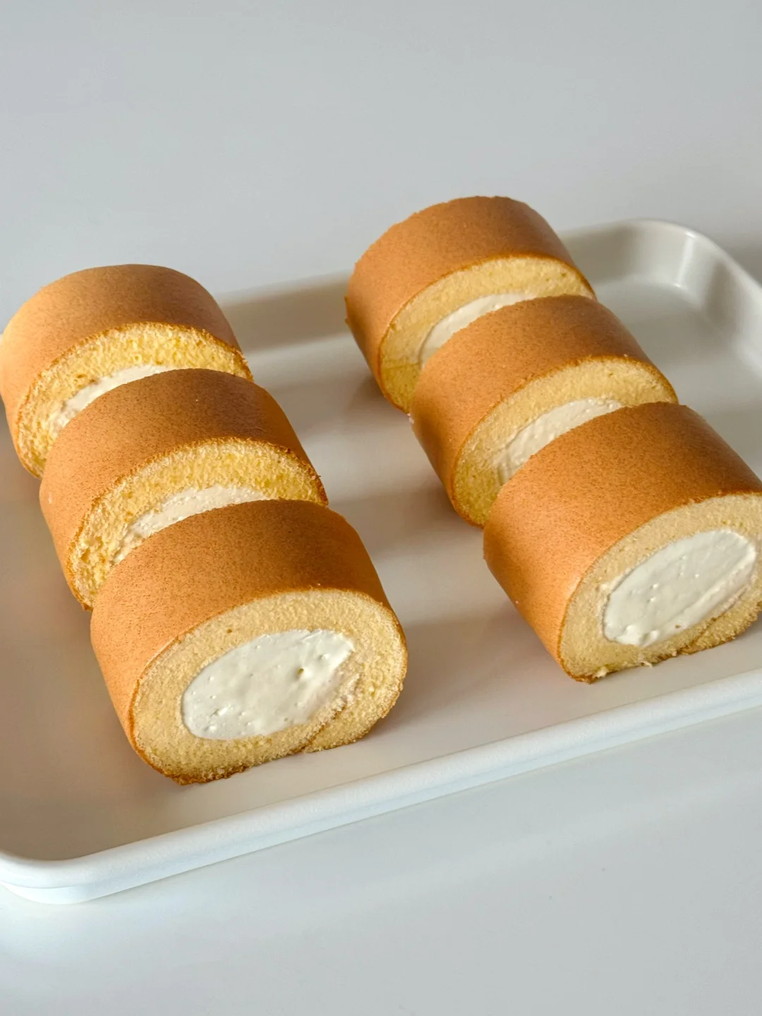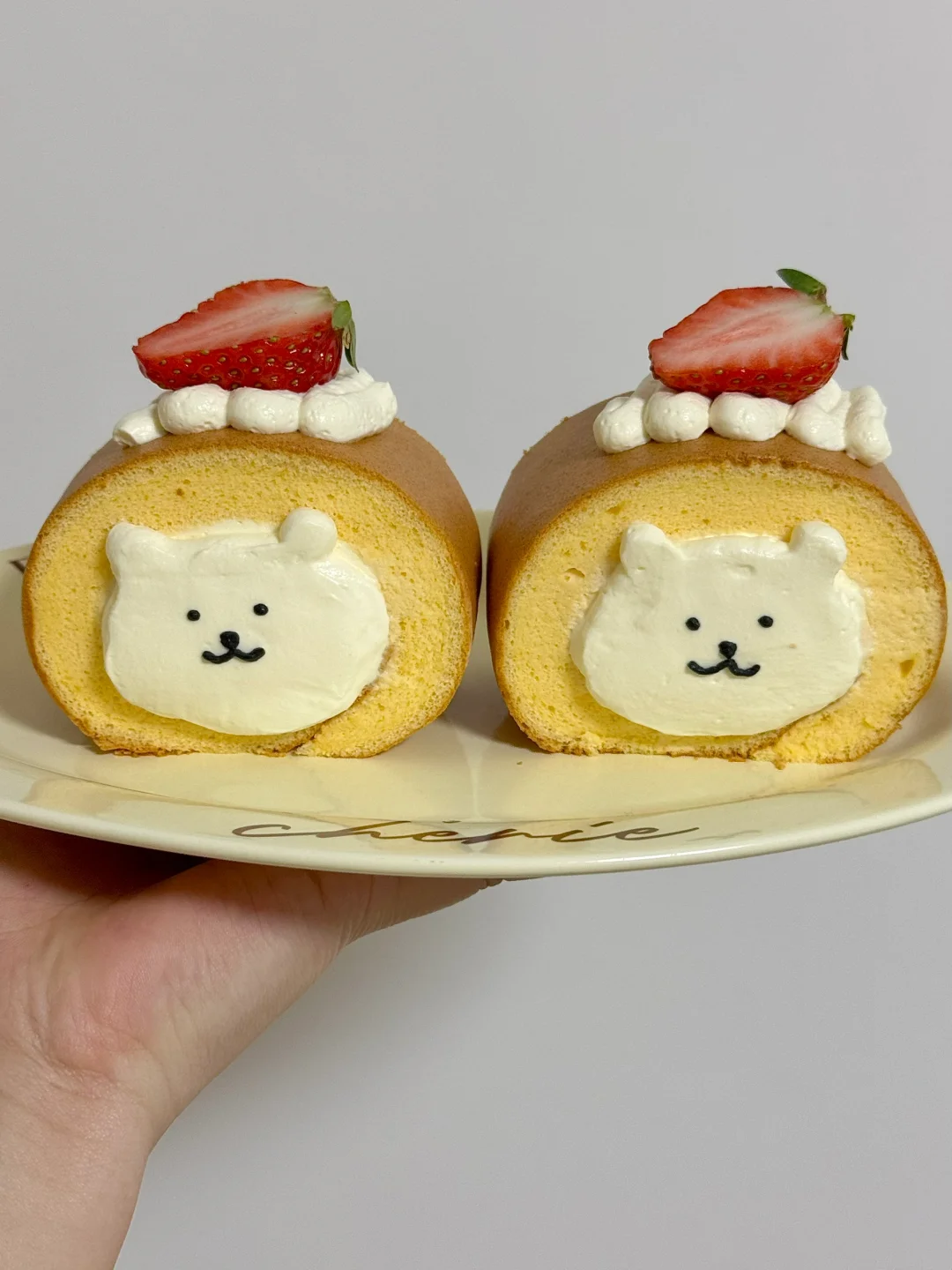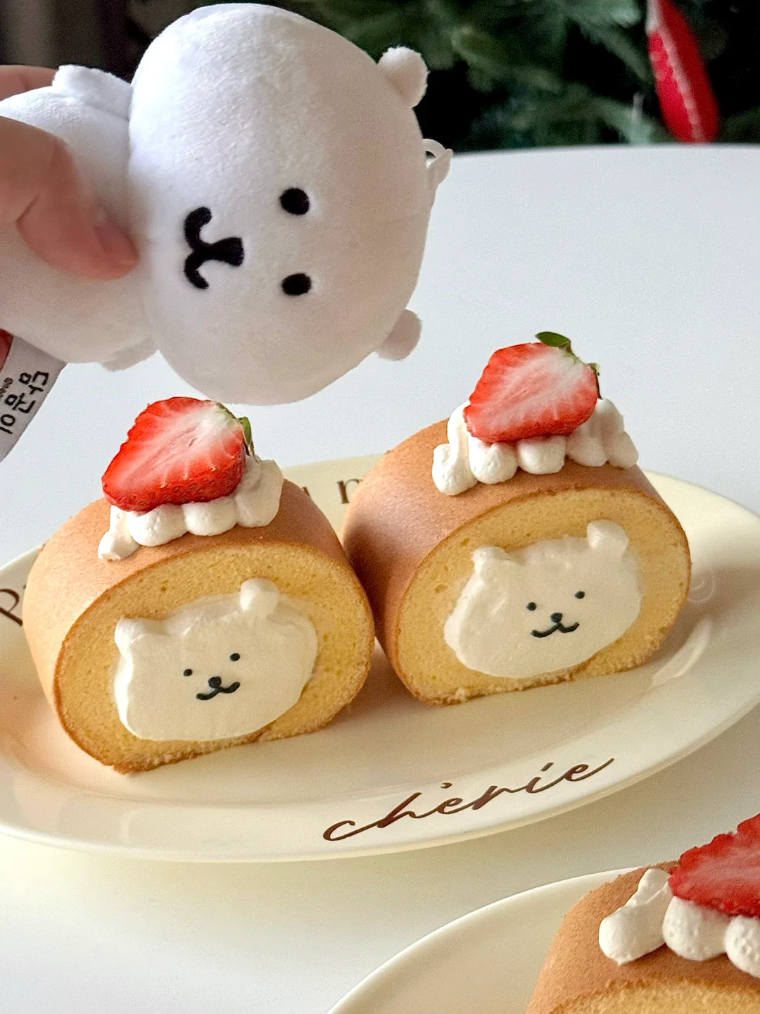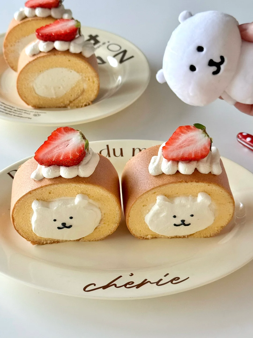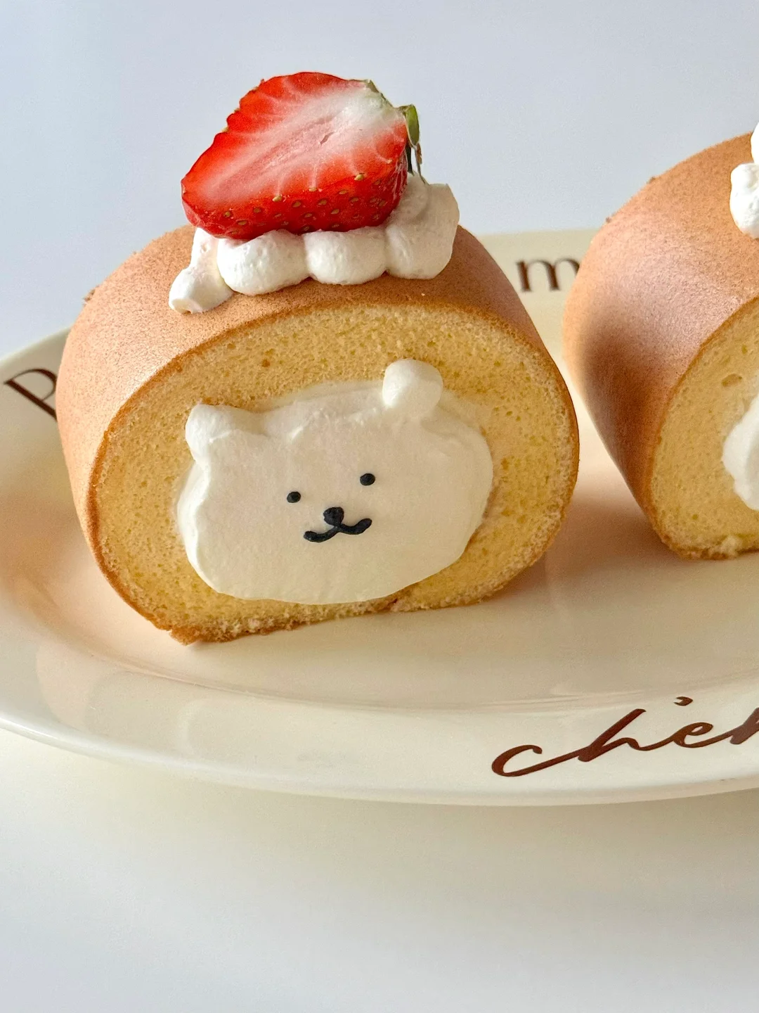 4️⃣取出蛋糕卷晾凉后加入奶油卷起切块,再用白色奶油挤出熊的形状,黑色奶油画出表情。
