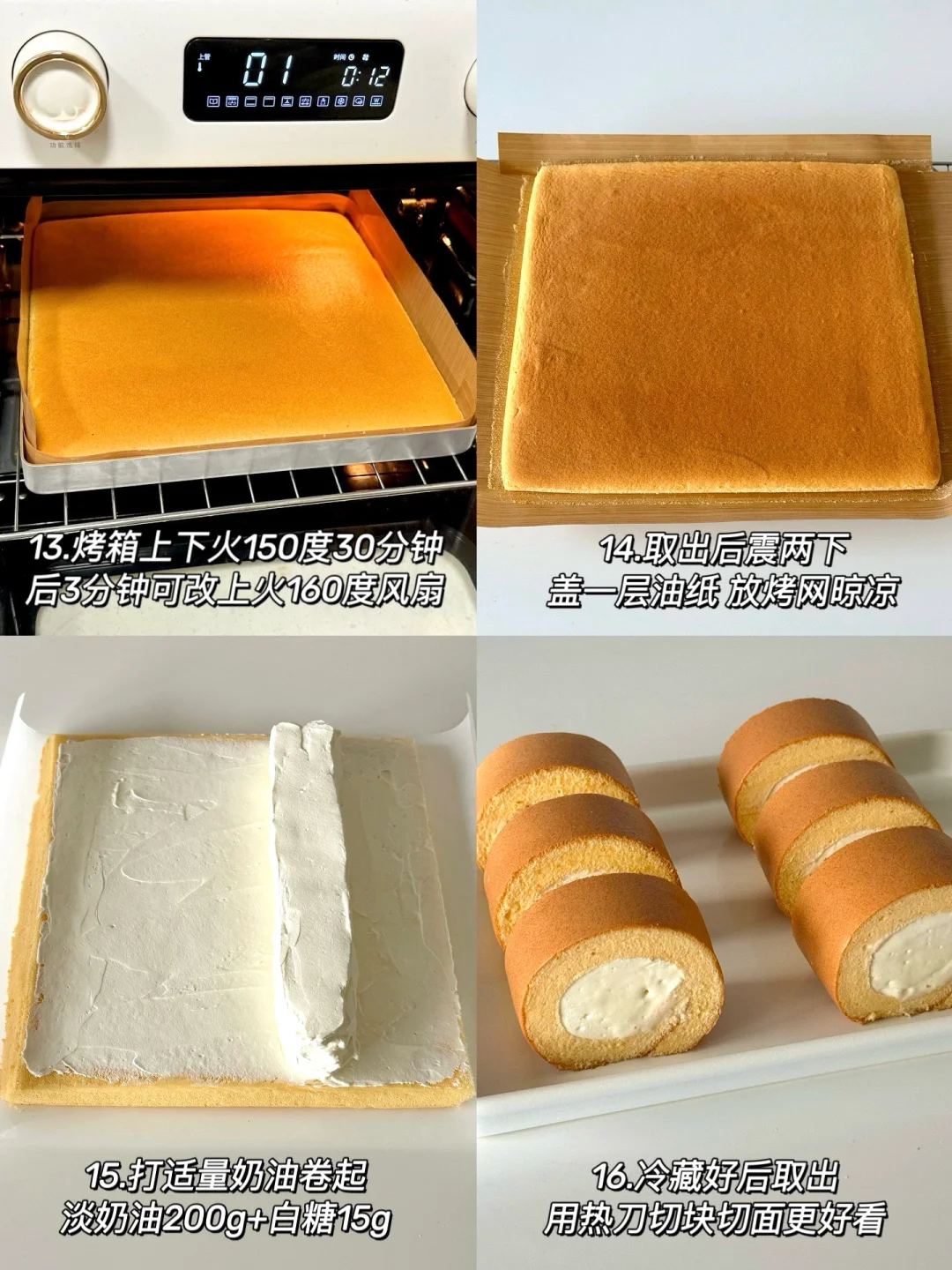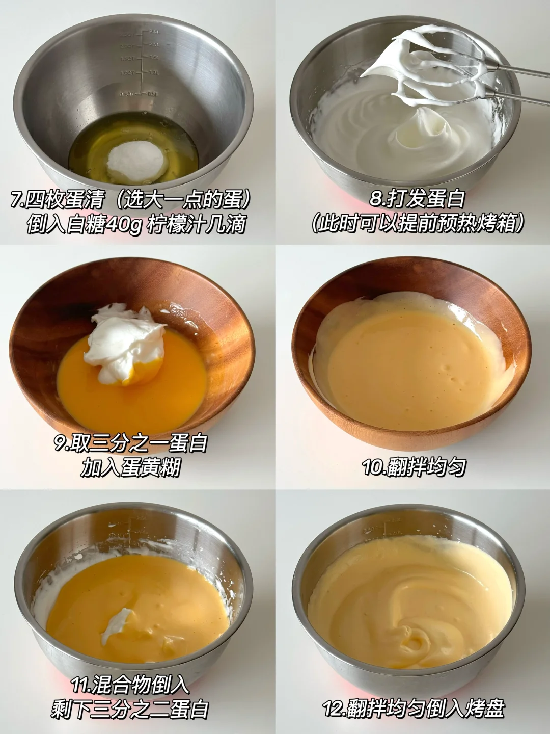 3️⃣在打发蛋白的时候可以提前预热烤箱至150度,蛋糕糊倒入烤盘中,烤箱中层上下火150度30分钟(烤箱有热风功能的倒数三分钟可以改上火160度热风)