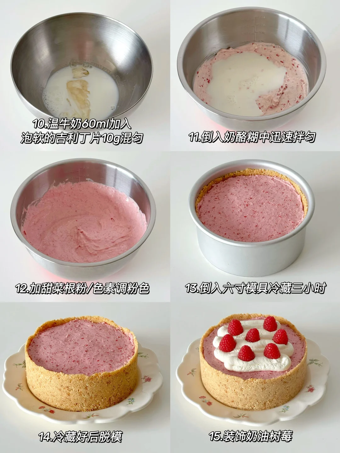 2️⃣奶酪糊材料依次加入拌匀后,加入吉利丁和温牛奶的混合物翻拌均匀(起到定型的作用)再加入甜菜根粉调粉色,接着放六寸模具冷藏三小时。
