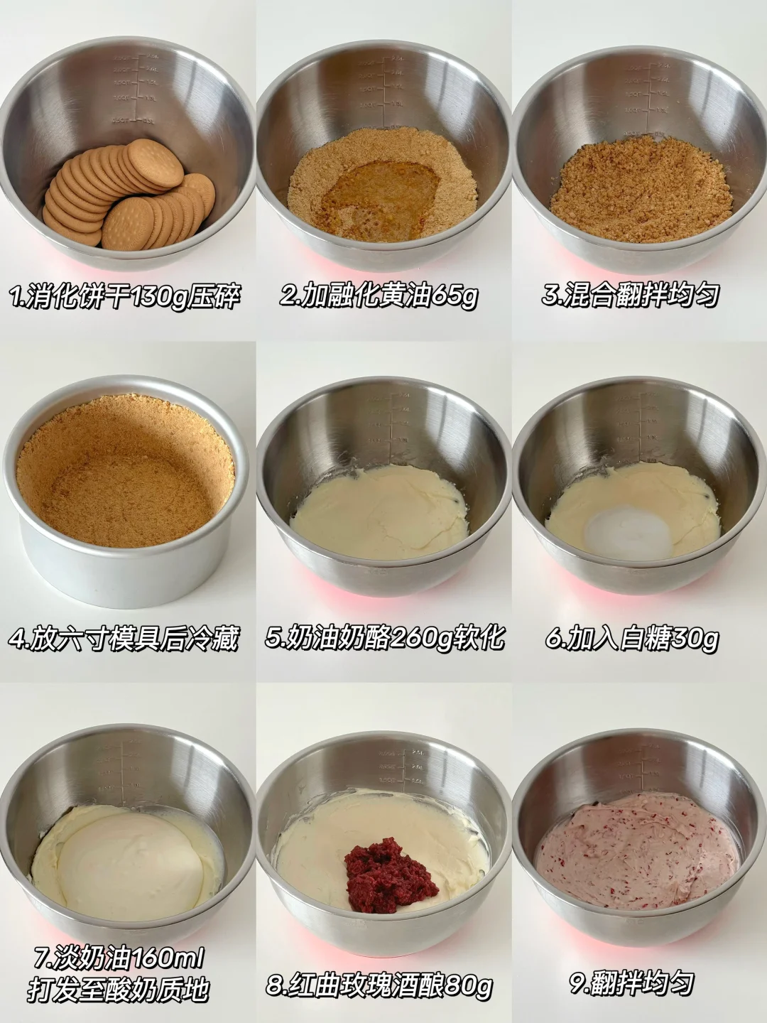 1️⃣饼干压碎加融化黄油拌匀放六寸模具冷藏定型。