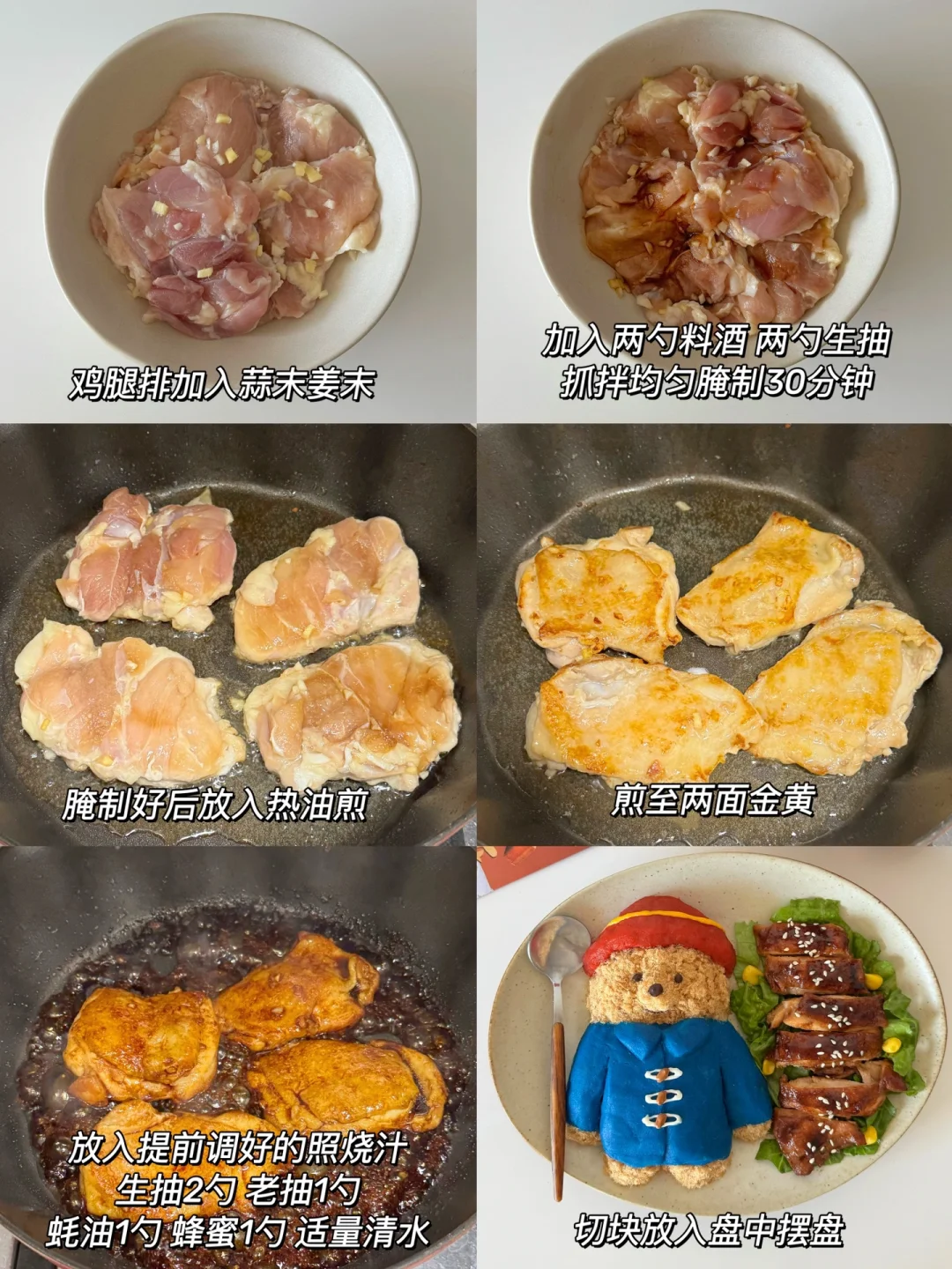 4️⃣腌制鸡肉,再红烧照烧鸡排后放盘中摆盘。