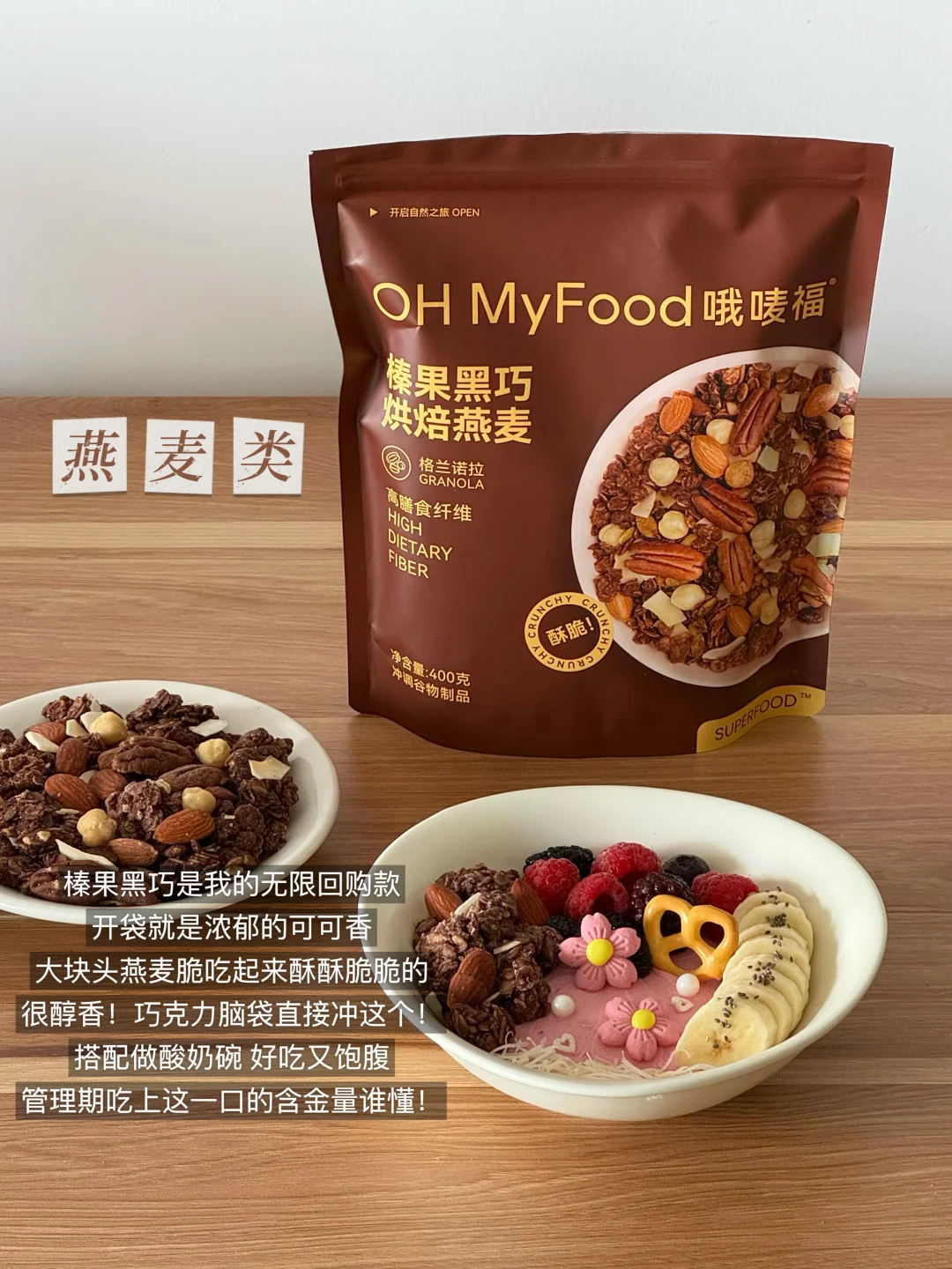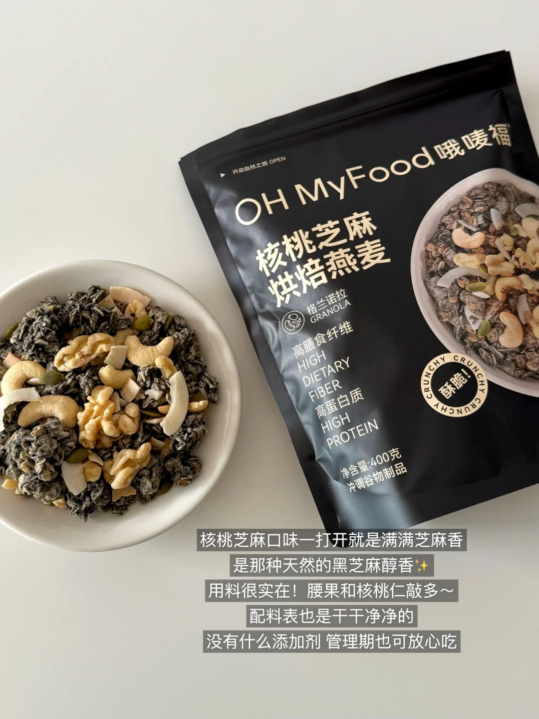 常年占据我回购榜单的ohmyfood烘焙燕麦🍫盒马里有榛果黑巧和核桃芝麻两种口味!都是我的心头好~大块头的燕麦脆搭配不同的坚果🥜吃起来酥酥脆脆好满足‼️配料表hin干净,搭配做酸奶碗饱腹感也很强,吃起来跟小甜品一样,管理期吃上这一口太幸福了!!