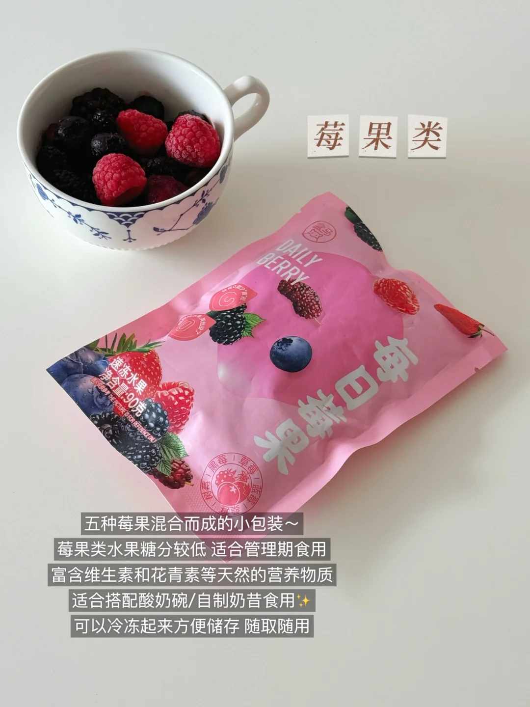 盒马的这款每日莓果小小一包刚好一次食用的量,五种莓果搭配~低卡高纤🉑做酸奶碗可以用来搭配好看又好吃。