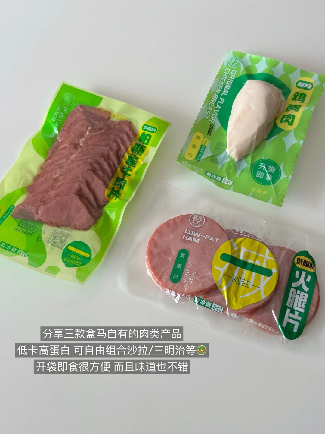 盒马自有的即食鸡胸肉、帕斯雀牛肉、火腿片都是管理期不错的选择👍低脂高蛋白,搭配沙拉自制轻食都很方便;还有虾仁🍤也可以多囤一些!