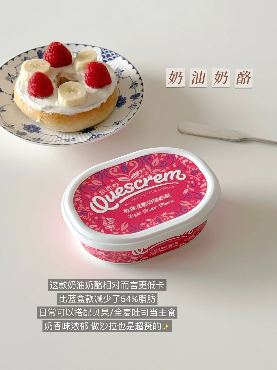 管理期可以选择这种✂️旨版的奶油奶酪搭配贝果做早餐,热量会低些~搭配各种果酱也hin好吃😋