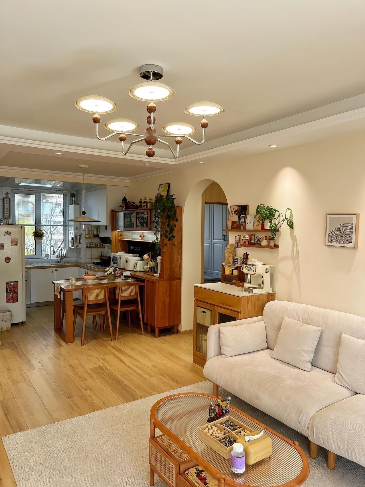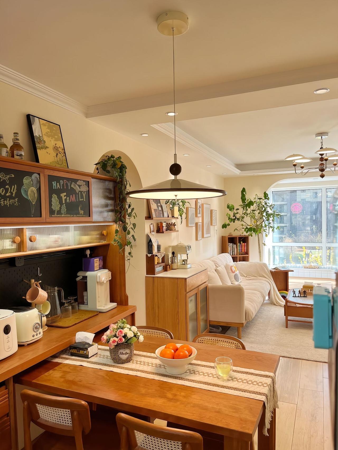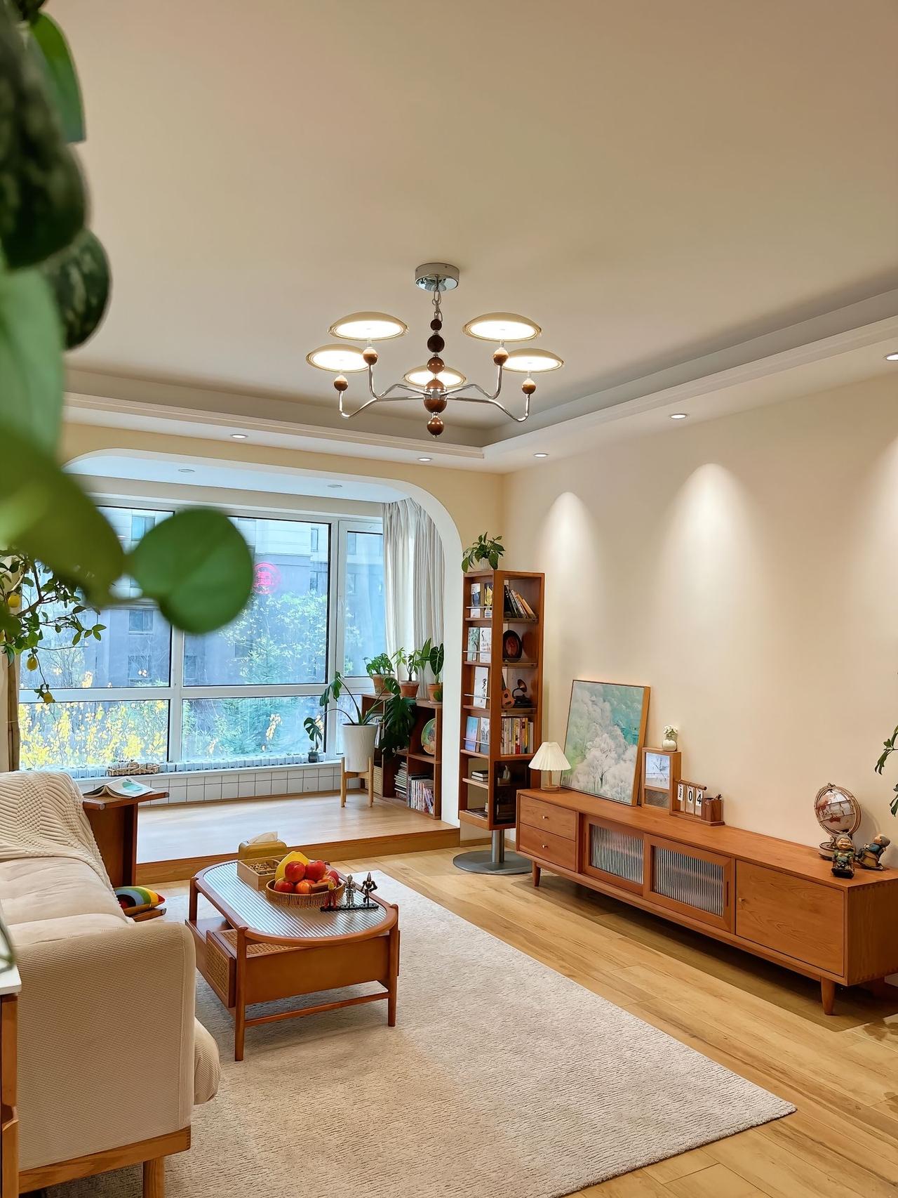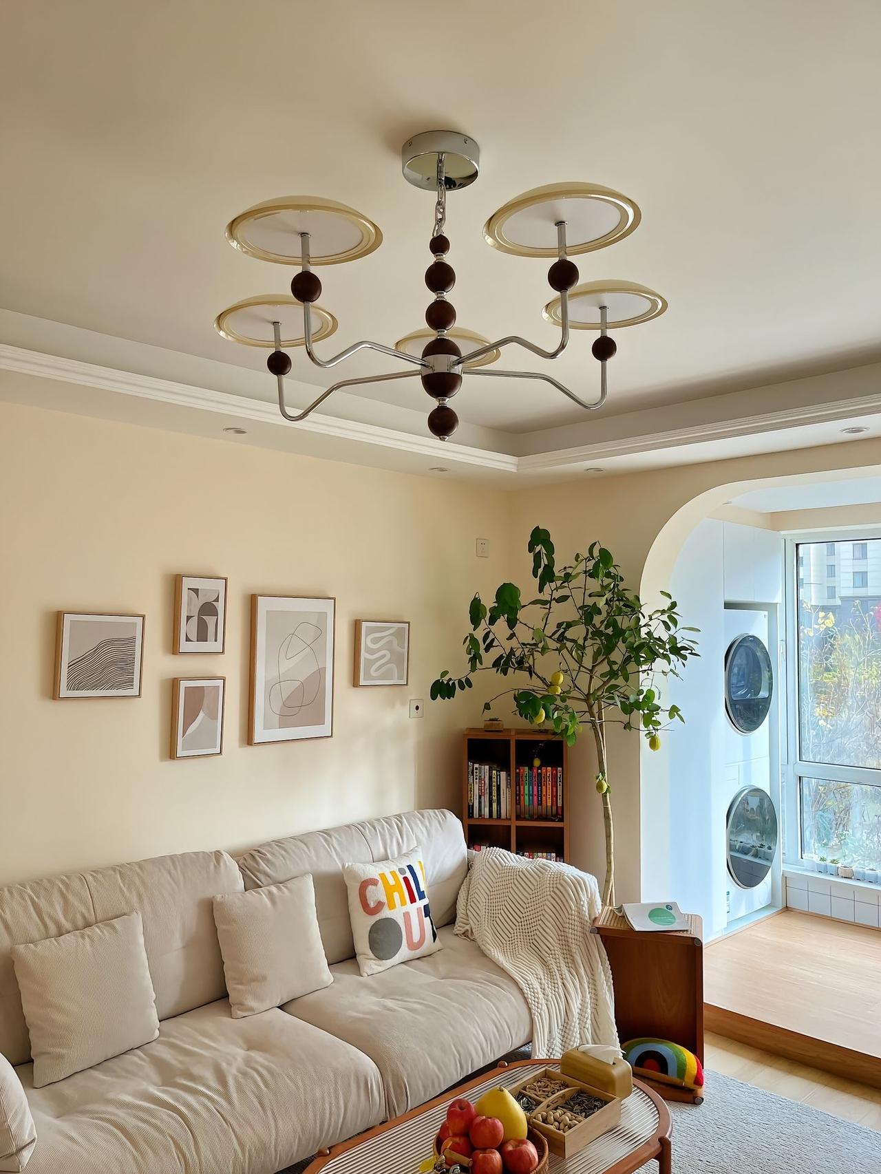 我家的客厅是一处满溢温馨的小天地。 米黄色墙面搭配简约石膏线,让空间显得柔和又雅致。一盏设计感十足的吊灯悬于头顶,金属与木球的组合别致有趣。 浅米色沙发松软舒适,“CHILL OUT”抱枕添了几分活力,旁边的柠檬树绿意盎然,还挂着几颗柠檬,角落的书架摆满书籍,透着文艺气息。 拱形门洞通向阳台,叠放的洗衣机巧妙嵌入,窗外景色宜人。茶几上的水果、坚果盒,还有彩色玩具,让这里充满生活烟火气,每一处细节都藏着我们对家的热爱,是能让人彻底放松的治愈角落。