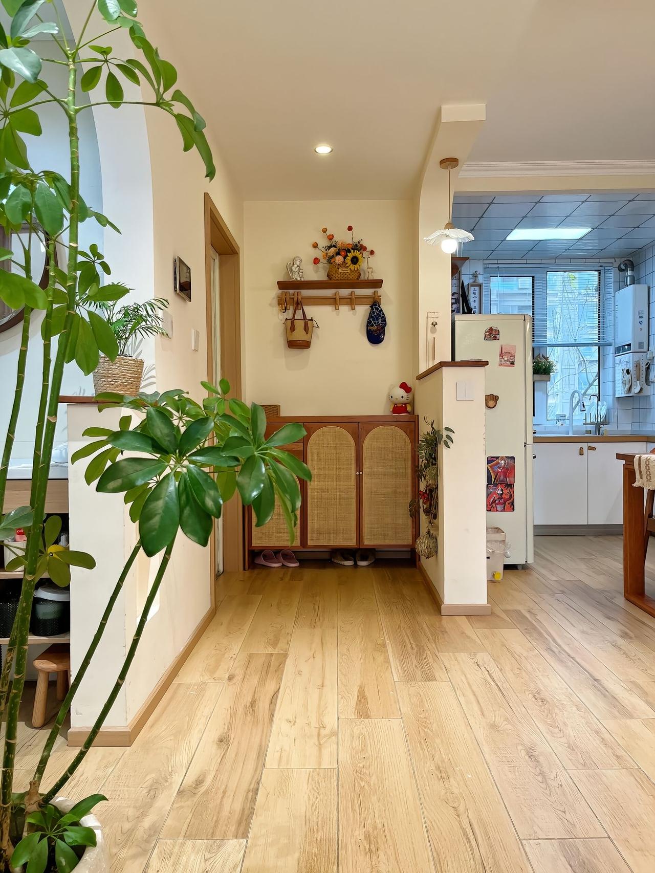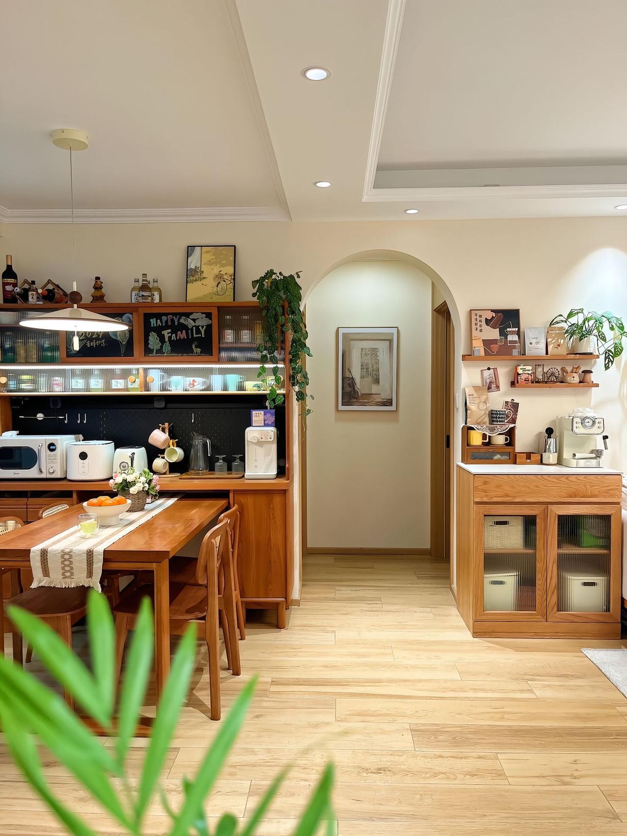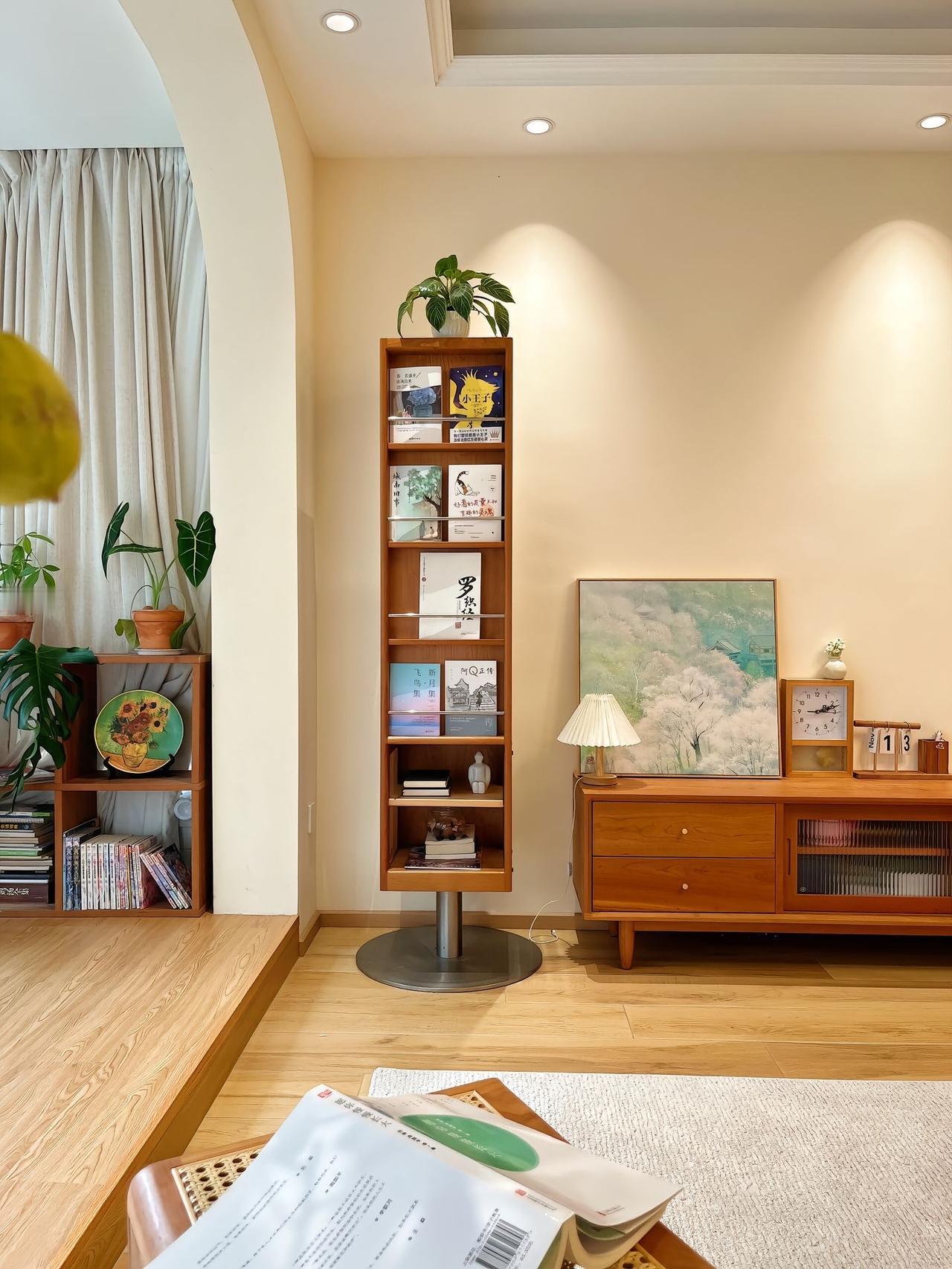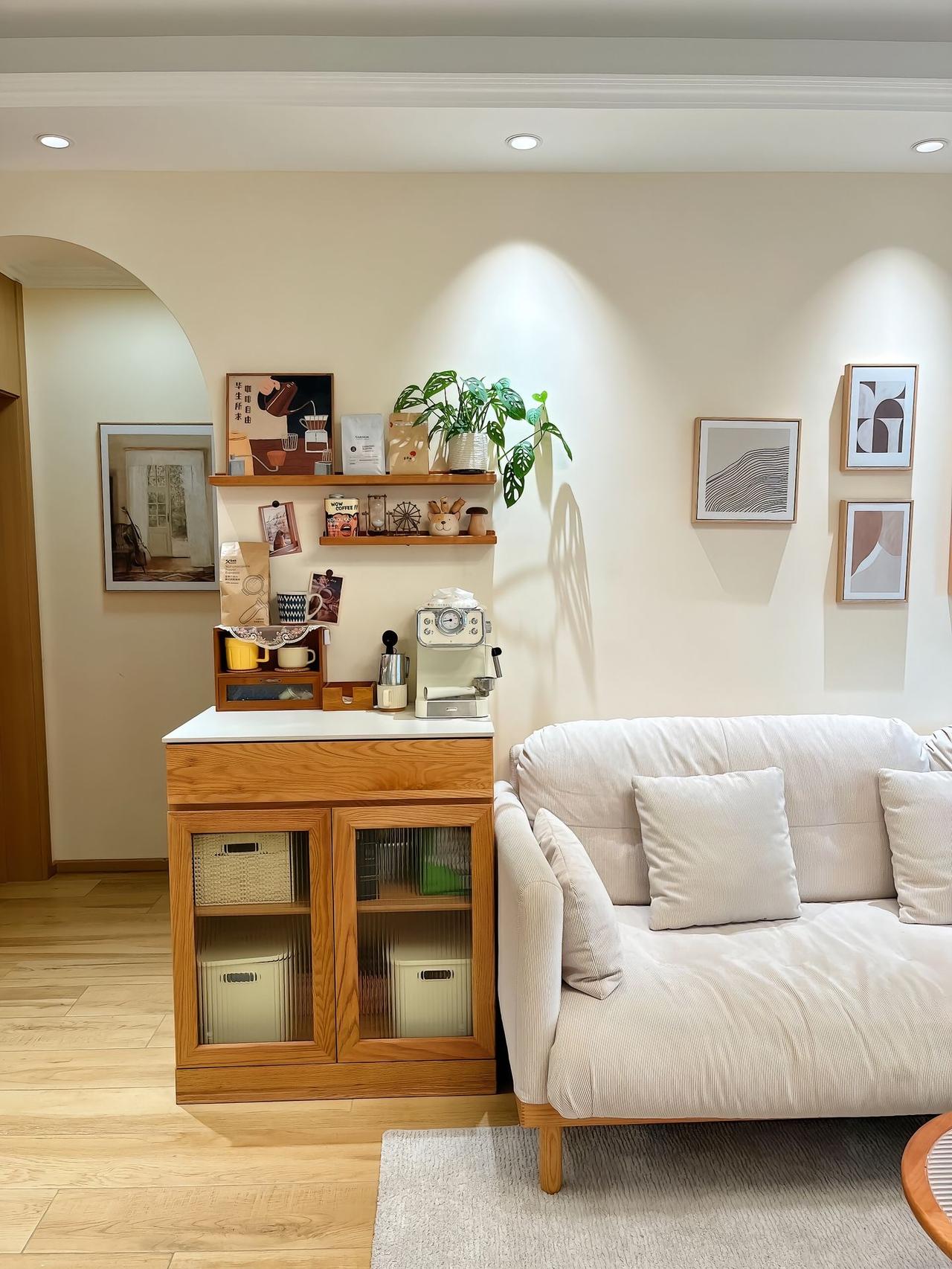 我家的客厅是一处满溢温馨的小天地。 米黄色墙面搭配简约石膏线,让空间显得柔和又雅致。一盏设计感十足的吊灯悬于头顶,金属与木球的组合别致有趣。 浅米色沙发松软舒适,“CHILL OUT”抱枕添了几分活力,旁边的柠檬树绿意盎然,还挂着几颗柠檬,角落的书架摆满书籍,透着文艺气息。 拱形门洞通向阳台,叠放的洗衣机巧妙嵌入,窗外景色宜人。茶几上的水果、坚果盒,还有彩色玩具,让这里充满生活烟火气,每一处细节都藏着我们对家的热爱,是能让人彻底放松的治愈角落。