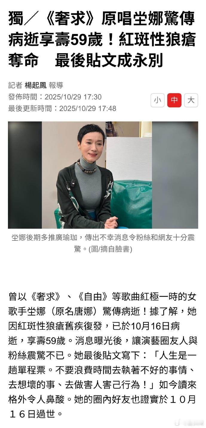 台湾艺人坣娜去世坣娜逝世 台湾女艺人坣娜今日传出离世消息,已被好友证实。她在上世纪80年代出道,发布《奢求》《别恋》《你怎么可以不爱我》等代表歌曲,曾两度获得金曲奖国语歌后提名。