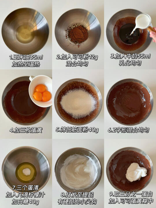 1️⃣玉米油加热至温热,加可可粉混匀,倒入牛奶乳化均匀,再加蛋黄搅匀,筛低筋面粉z字形搅匀。