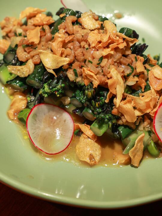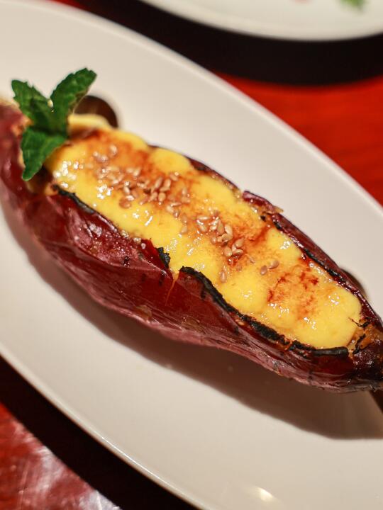 烤了许久的鸡中翅,属实入味;边缘焦脆的鸡翅,顶部加入了蒜末与灵魂酱,使得在咬开焦皮之后,酱汁随着冒热气的鸡翅肉一起吃,口味丰富却不咸腻,一切都恰到好处。