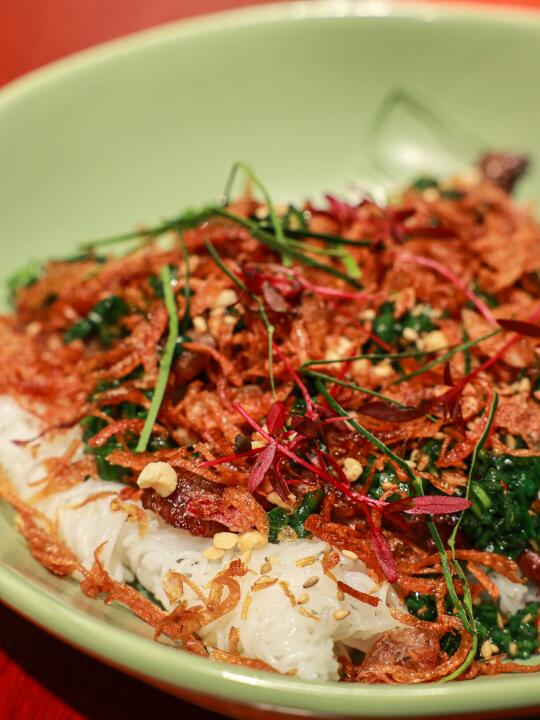 “滨海”在越南语指的是干煎米粉或者檬粉,就是那种很细的米粉条;整道菜搭配了花生碎、牛柳肉和酸菜,推荐吃法是夹起一块粉饼,再沾点自制甜辣酱一口吃下。每一口的感觉有点像不带皮的越南春卷。