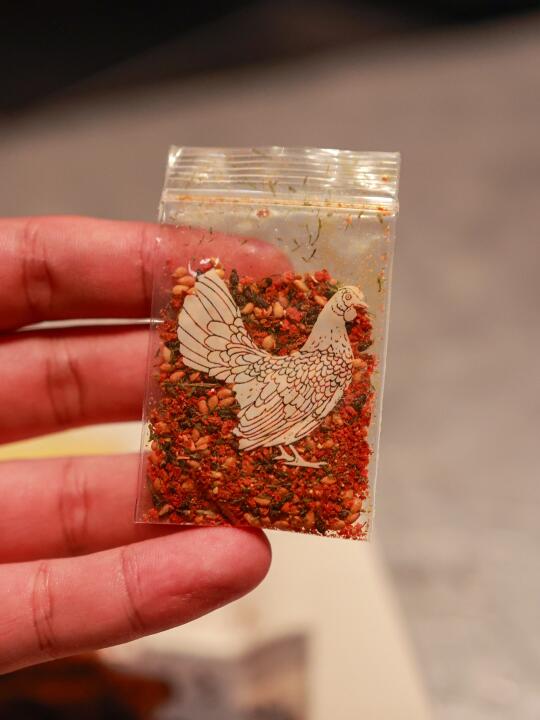🧾买单的时候很有趣,服务员会递来一个盘子,里面是一包当晚的辣椒料作为伴手礼,和一张扫码即可支付的二维码。