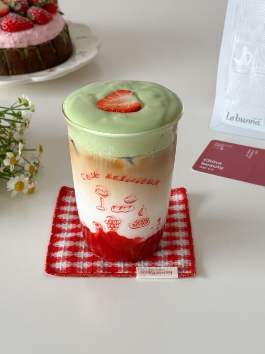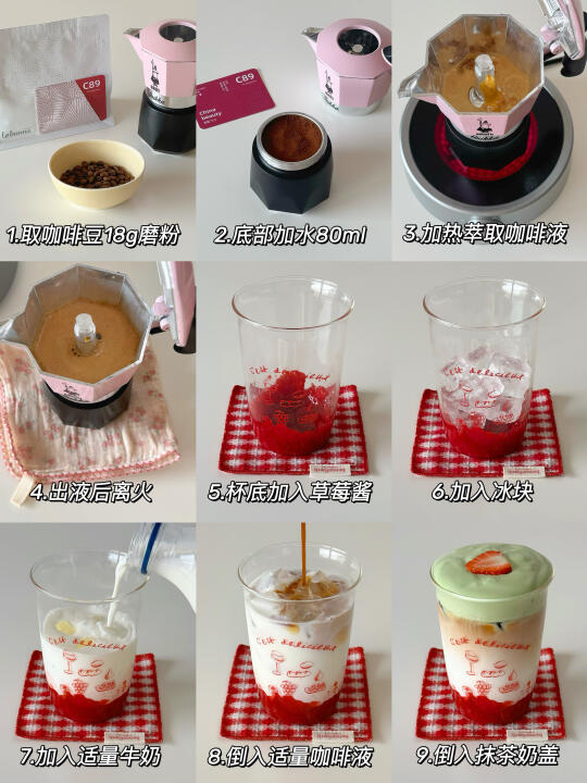 再用咖啡豆做一杯抹茶草莓拿铁,萃取的咖啡带着淡淡的玫瑰和花果香🌹和我的草莓蛋糕太适配啦!幸福的下午茶轻松拿捏✌️