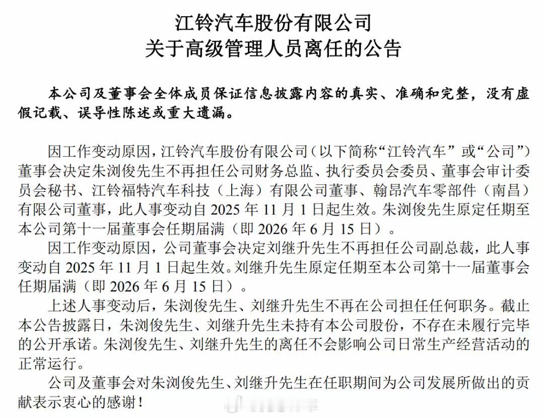 江铃汽车发布公告称,因工作变动原因,公司董事会决定朱浏俊不再担任公司财务总监、执行委员会委员、董事会审计委员会秘书、江铃福特汽车科技(上海)有限公司董事、翰昂汽车零部件(南昌)有限公司董事等职务,刘继升不再担任公司副总裁,两项人事变动均自2025年11月1日起生效。
