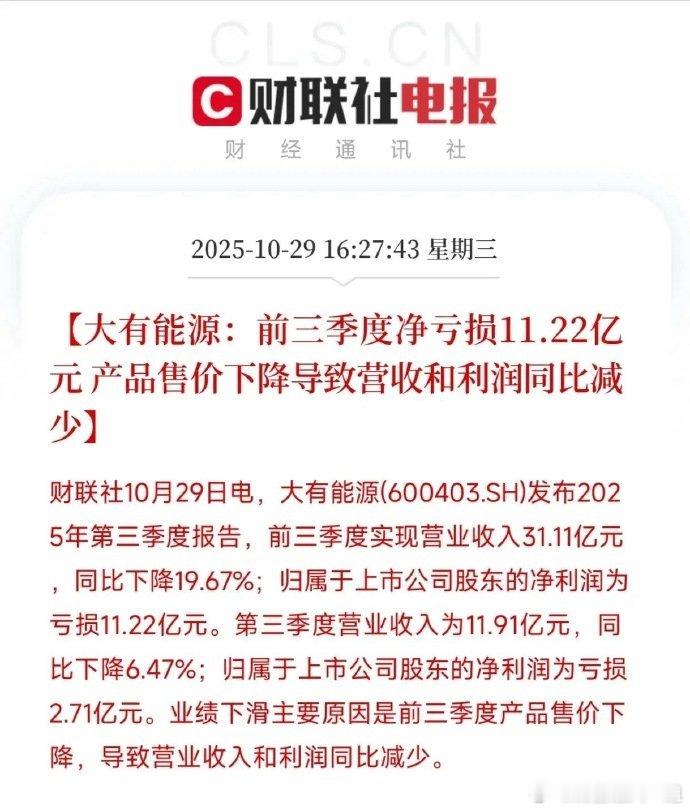 大有能源这份三季报一出,估计不少持股的朋友心里咯噔一下。前三季度净亏损11.22亿元,营收同比下滑近20%,单季度也亏了2.71亿元——这数据摆在那儿,想绕都绕不开。