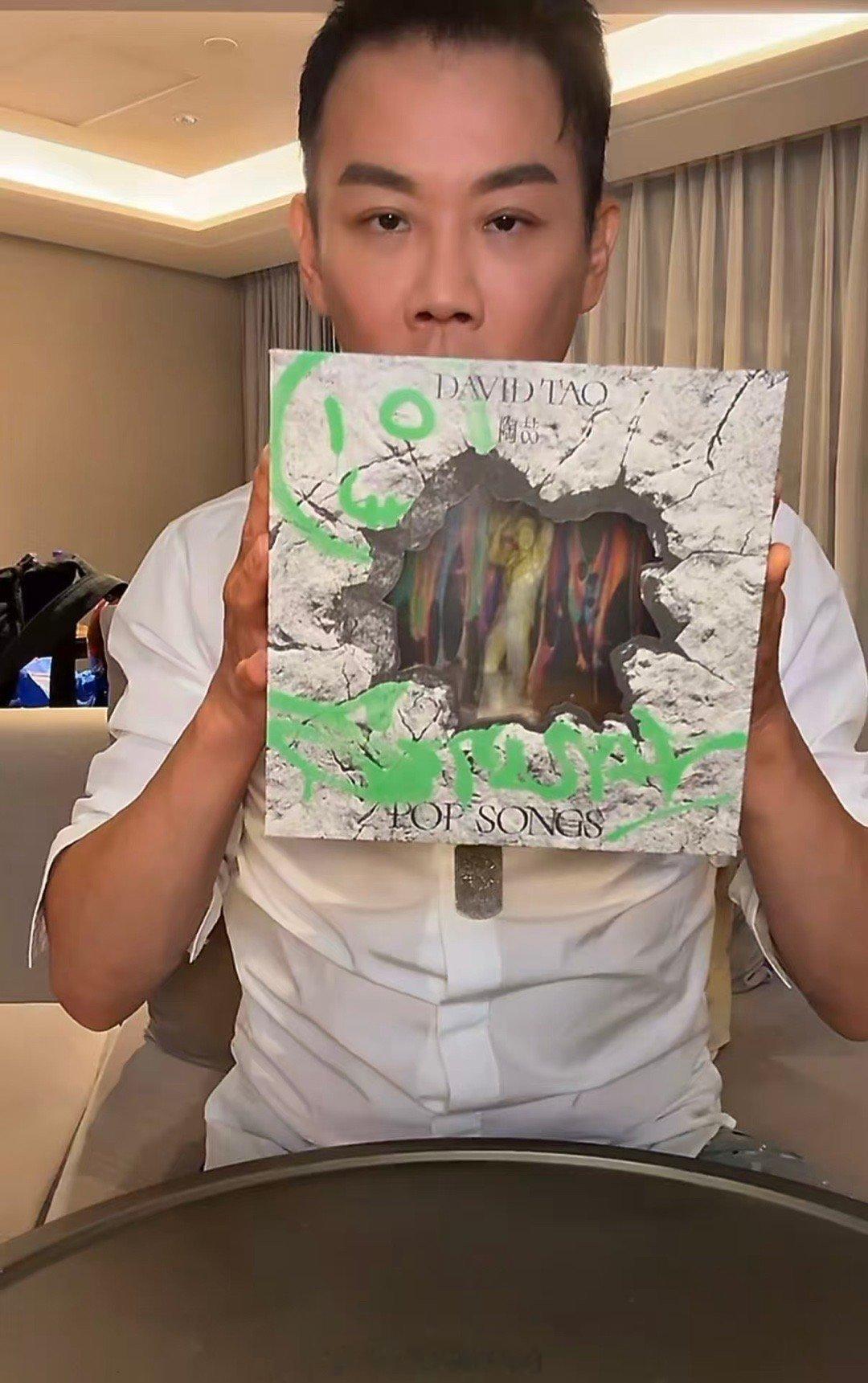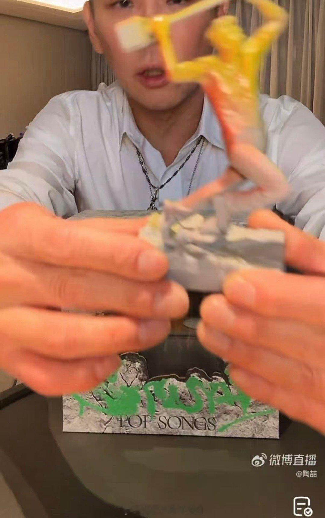 陶喆直播开箱实体专辑 今晚开箱直播的名场面太多了!“番茄炒蛋色”公仔一亮相就吸睛,拿大铁片刮刮乐时,刮出歌词还兴奋地念出来,全程笑容没断过,感染力超强。
