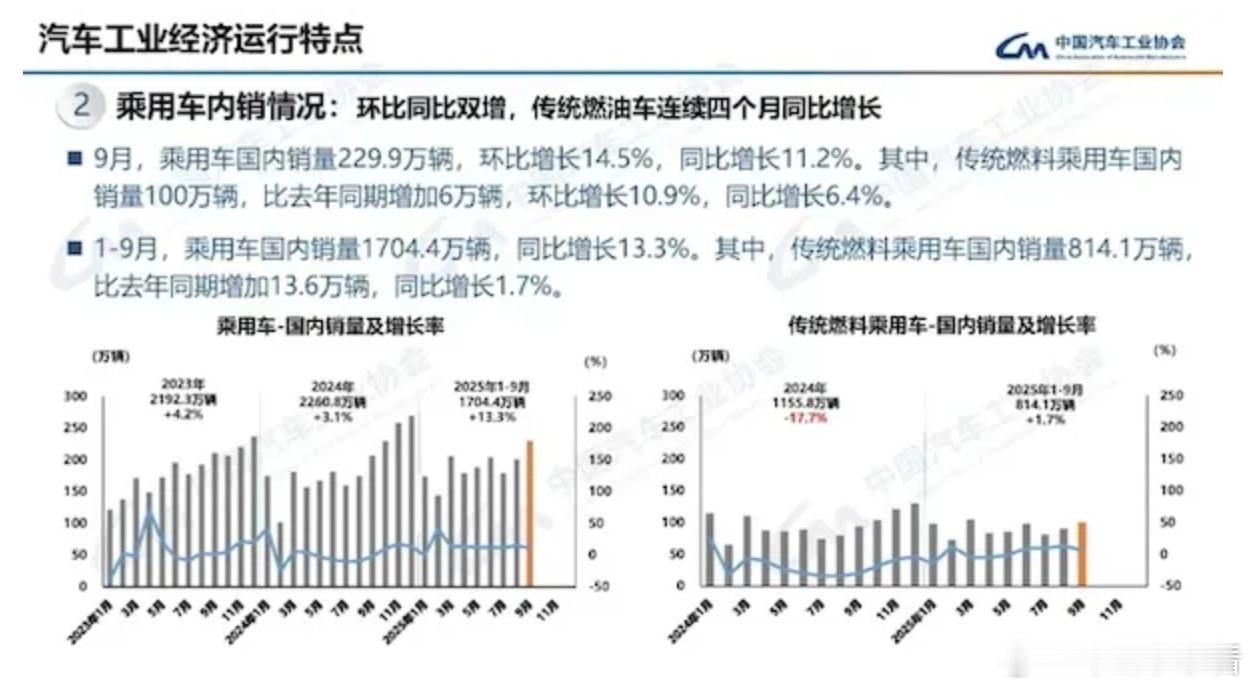 今年1-9月,乘用车国内销量为1704.4万辆,同比增长13.3%。其中,传统燃油车国内销量为814.1万辆,比去年同期增加13.6万辆,同比增长1.7%,作为对比,2024年传统燃油乘用车销量的同比跌幅达到17.7%。