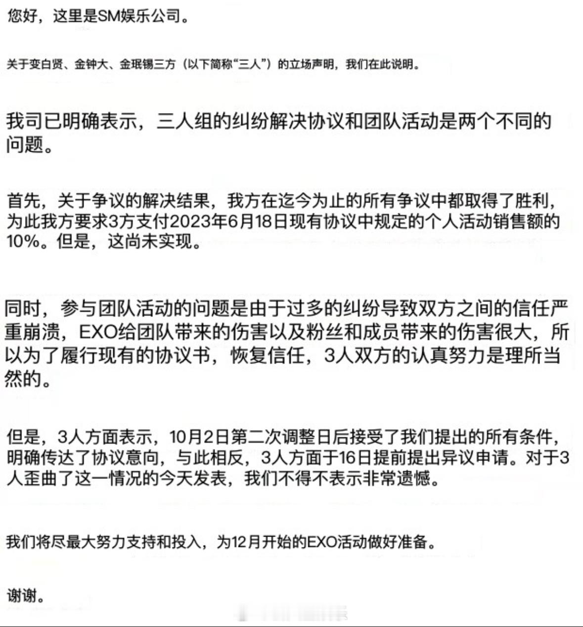 SM说CBX对EXO与粉丝造成的伤害很大SM称CBX歪曲全面接受要求的事实SM