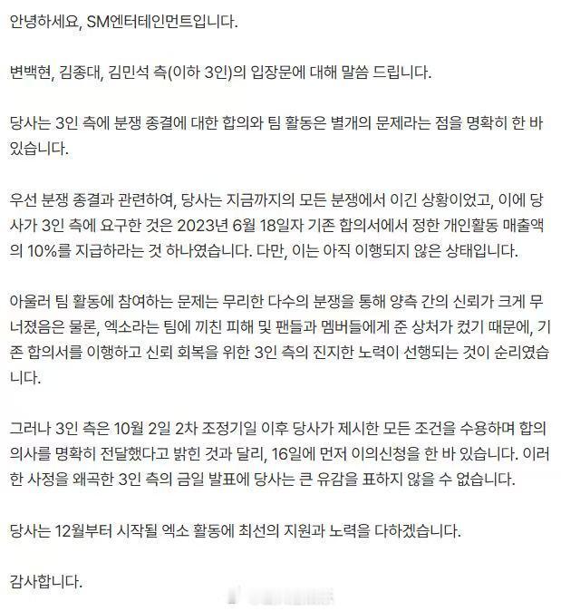 SM说CBX对EXO与粉丝造成的伤害很大SM称CBX歪曲全面接受要求的事实 SM说CBX对EXO与粉丝造成的伤害很大 ​​​