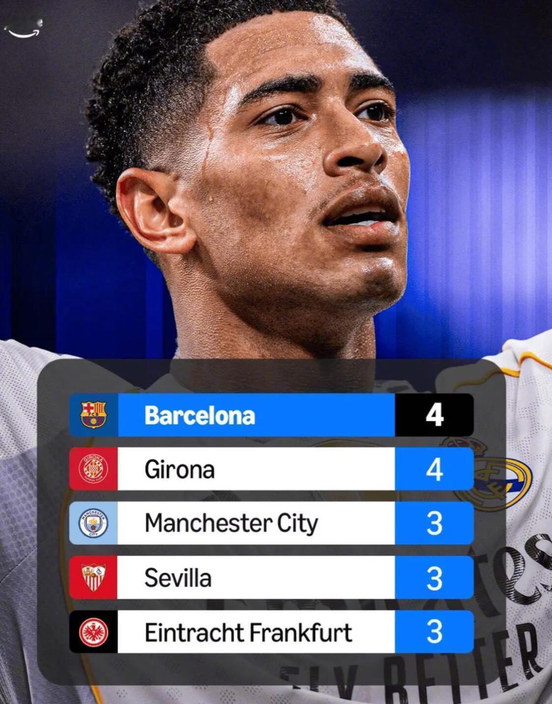 绿茵资讯! ★五大联赛目前的积分总榜! 皇马第一,拿到了27个积分。 ★我承认我笑了! 曼城本赛季英超射手榜第二名是伯恩利后卫埃斯特夫,他一个人贡献了两记乌龙。 ★英超球员每90分钟跑动距离榜! 福登12.40km排名第1,维尔茨排名第3,但表现吗?实在是差强人意。 ★谁能笑到最后! 英超第5轮,利物浦第一,比第二的阿森纳多5分。 英超第9轮,仅仅又踢了四场比赛,利物浦第七,比第一的阿森纳少7分。 ★苦尽甘来! 阿尔特塔的阿森纳这个赛季有望冲击四冠王。 ★巴萨是贝林厄姆最喜欢的对手之一,他已经4次攻破巴萨的球门。 ★结果都是输球! 同样的加纳乔,同样的场地,同样的进球庆祝,同样的结果,不一样的是从红色变成了蓝色。 ★金童奖候选名单身价排名榜! ★无用射手! 圣地亚哥・希门尼斯成为米兰队史第4位在联赛前9轮出场却未能取得进球的前锋。