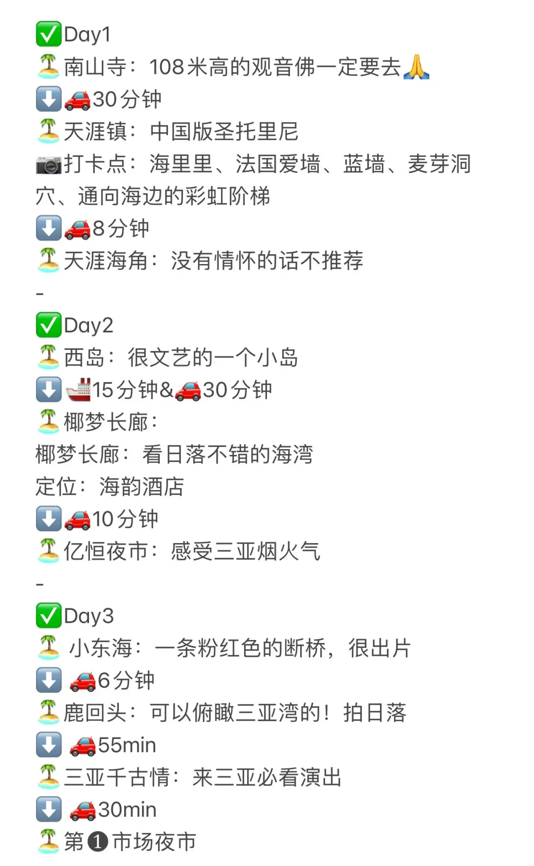 主打休闲放松,合适亲子及想度假的朋友,按照首图的景点玩!主要深度游玩亚龙湾和海棠湾!这些景点合适3-5天慢慢玩!