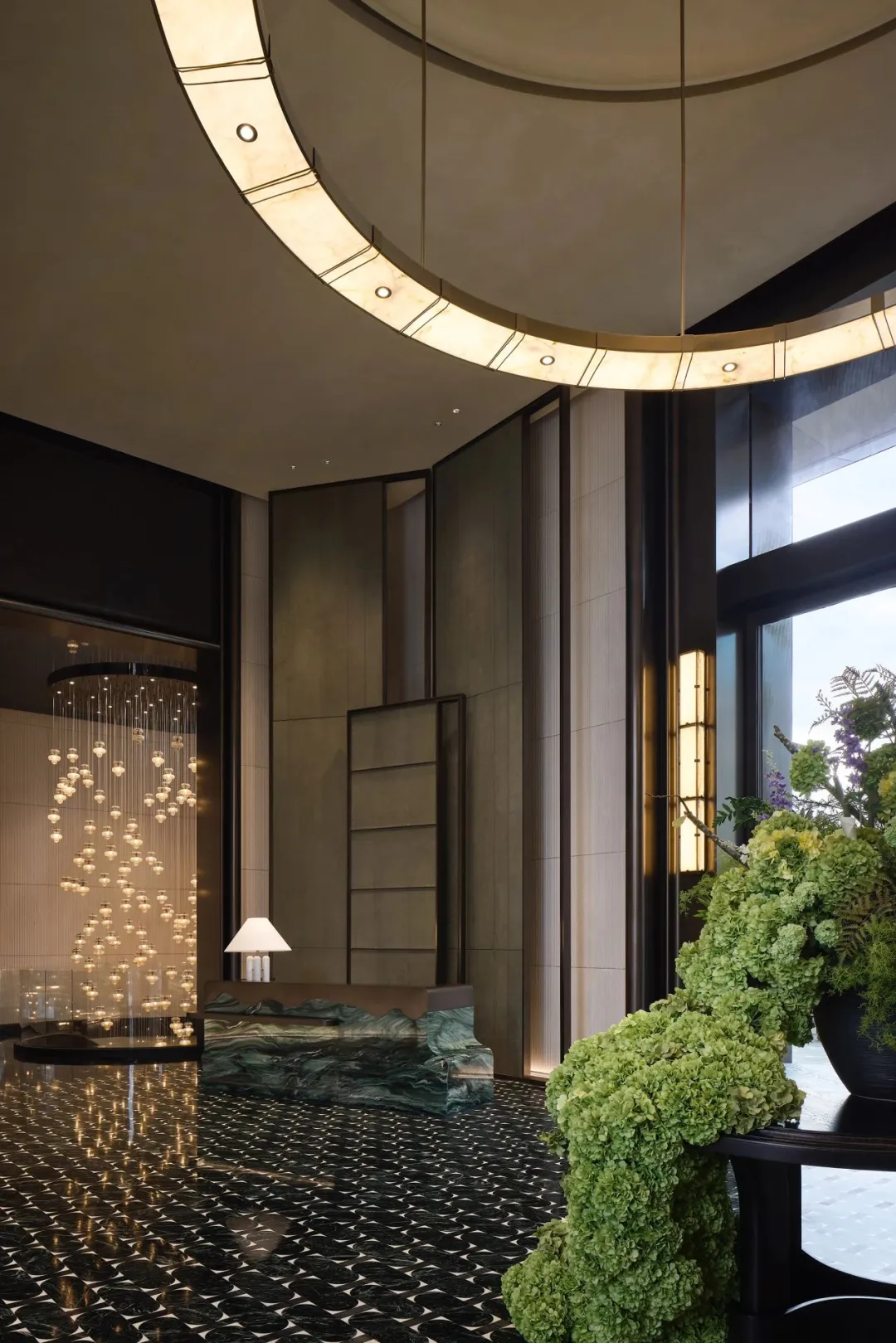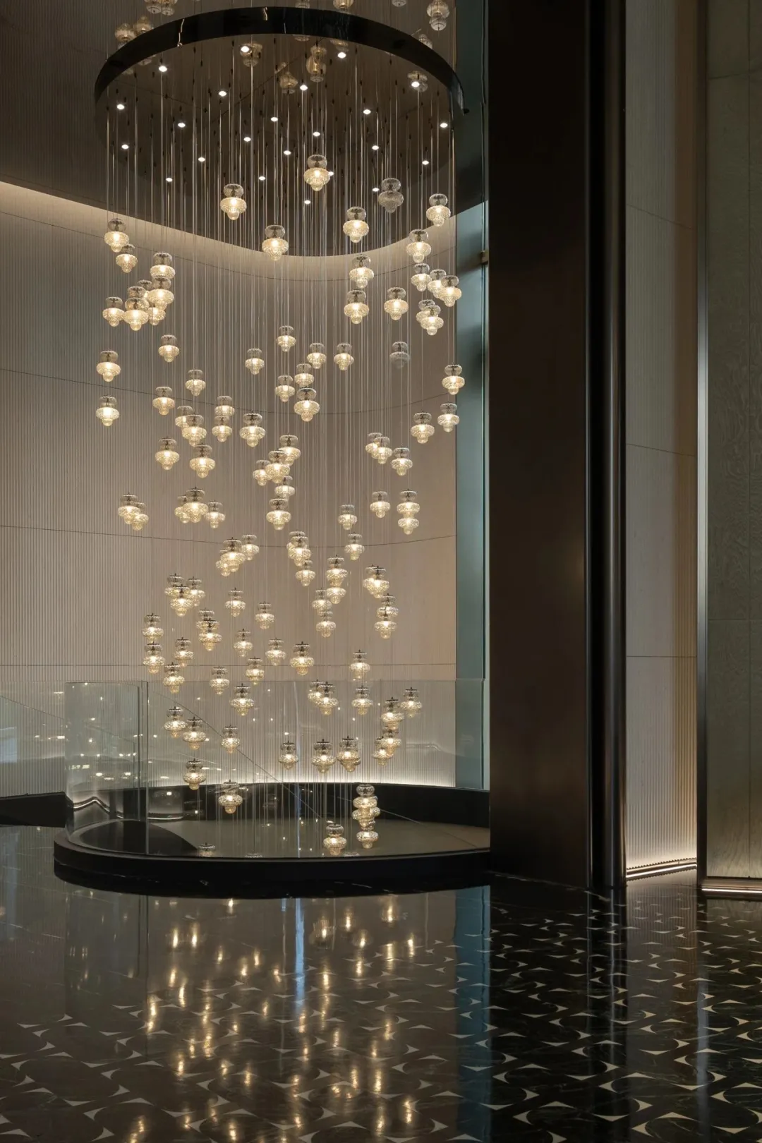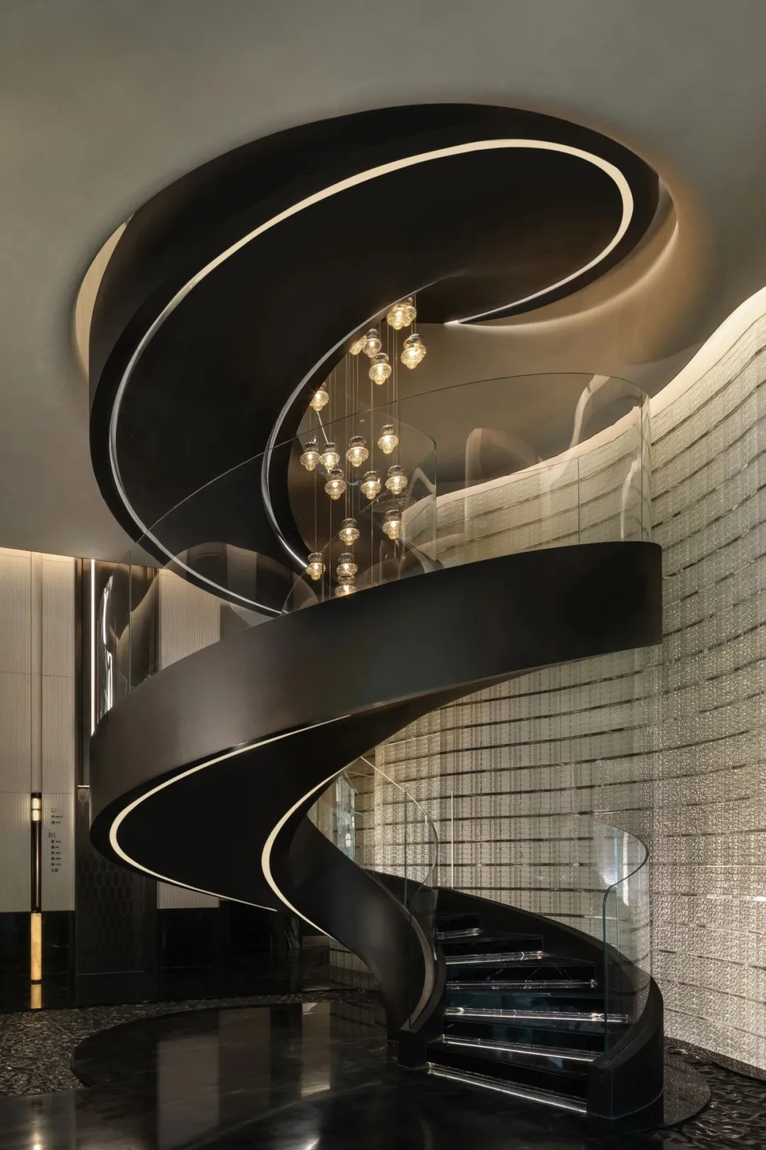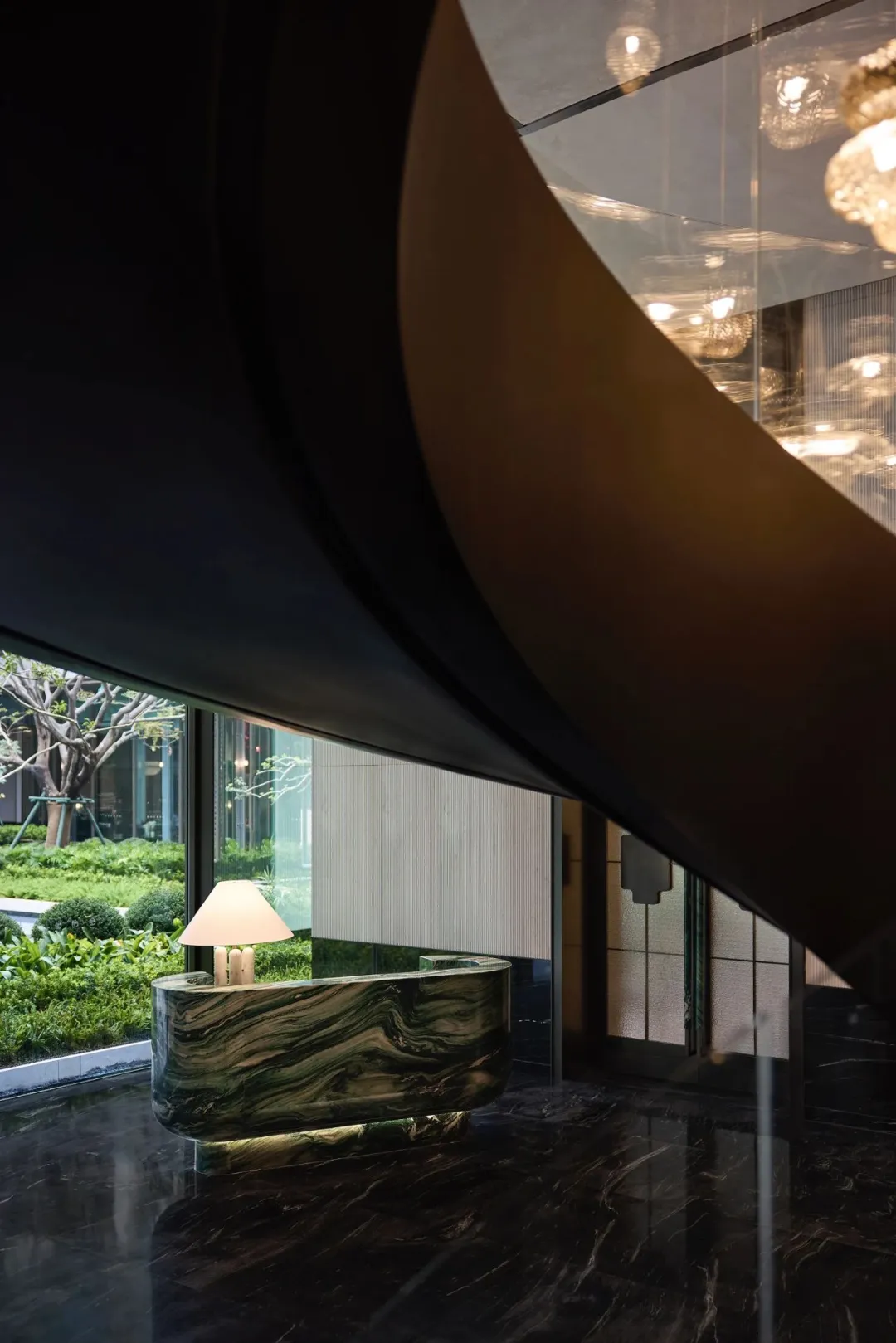 中轴对称的大气前厅、如玉带垂落的螺旋楼梯、大珠小珠般洒落的艺术灯饰,每一处细节都藏着隐奢的质感。
