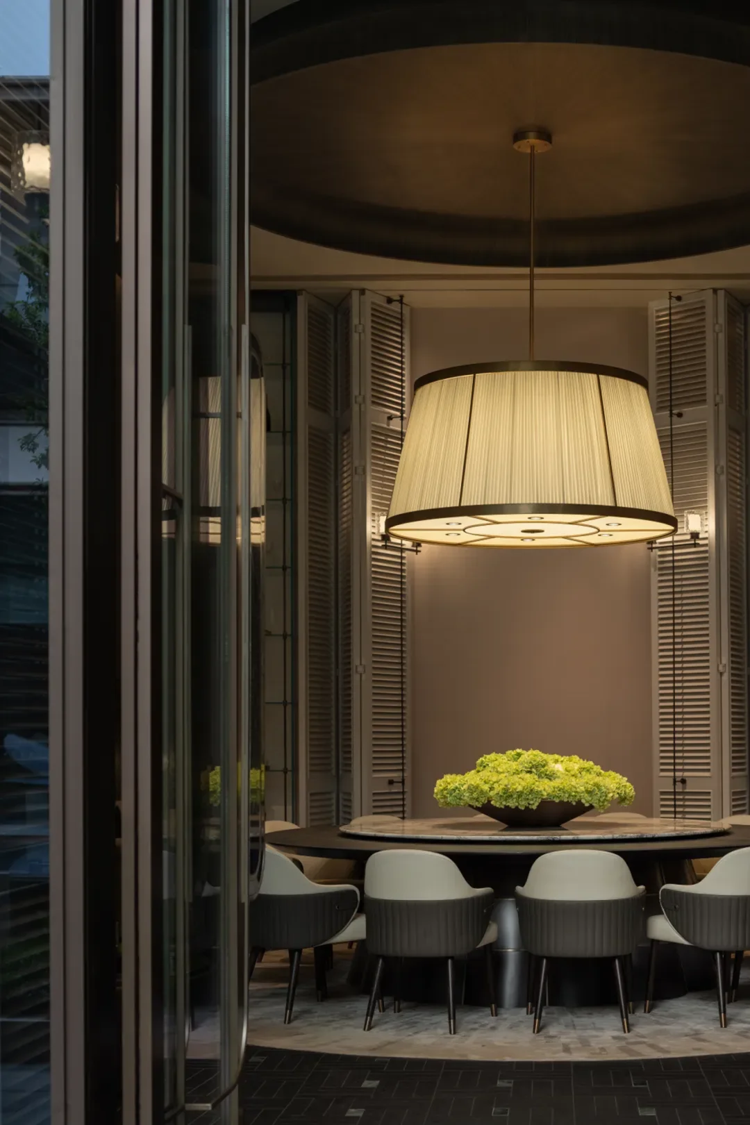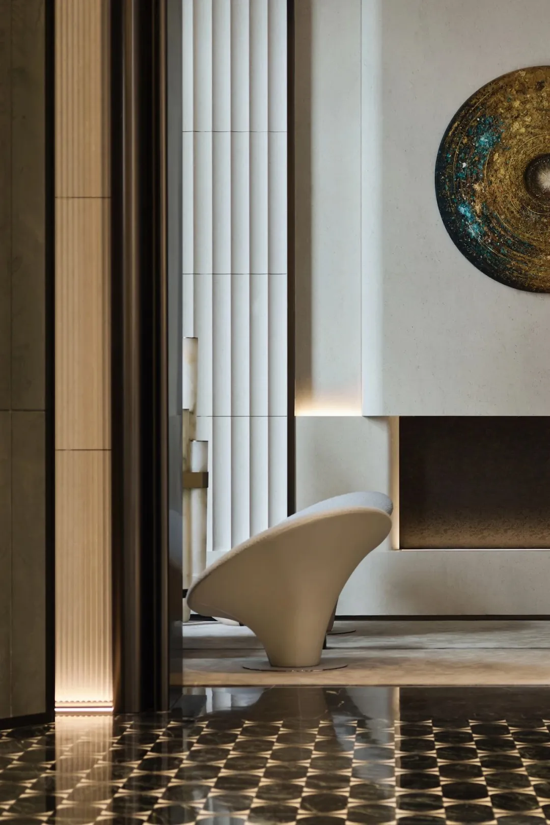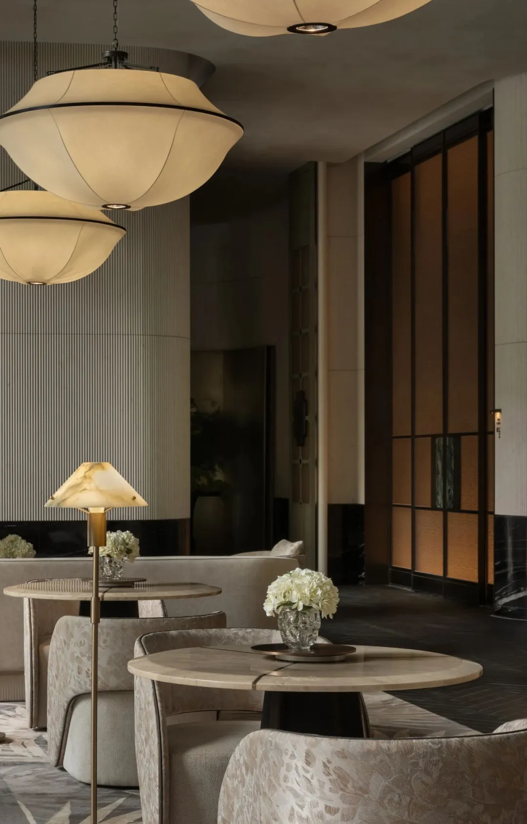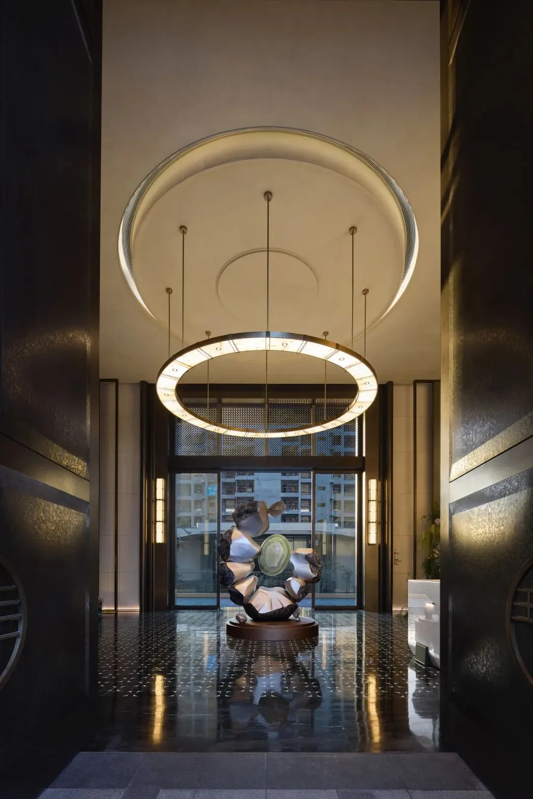 中轴对称的大气前厅、如玉带垂落的螺旋楼梯、大珠小珠般洒落的艺术灯饰,每一处细节都藏着隐奢的质感。
