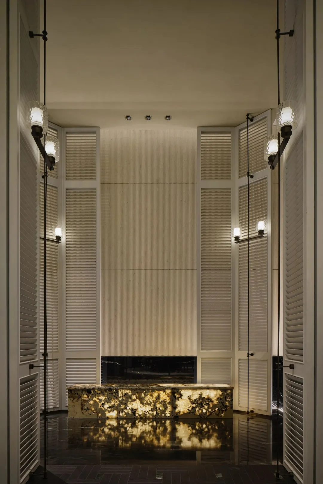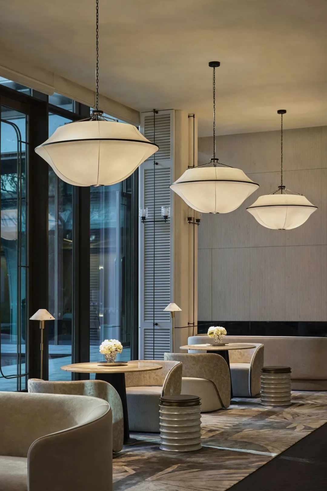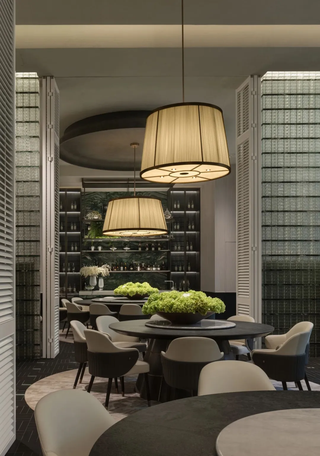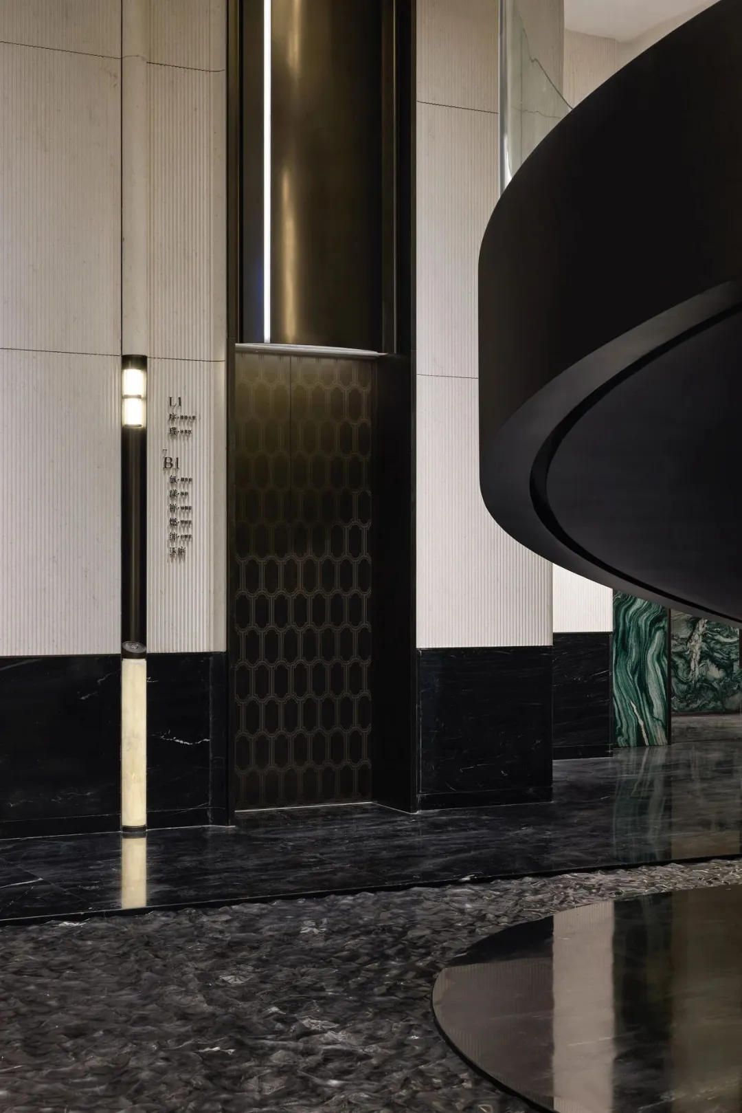 中轴对称的大气前厅、如玉带垂落的螺旋楼梯、大珠小珠般洒落的艺术灯饰,每一处细节都藏着隐奢的质感。