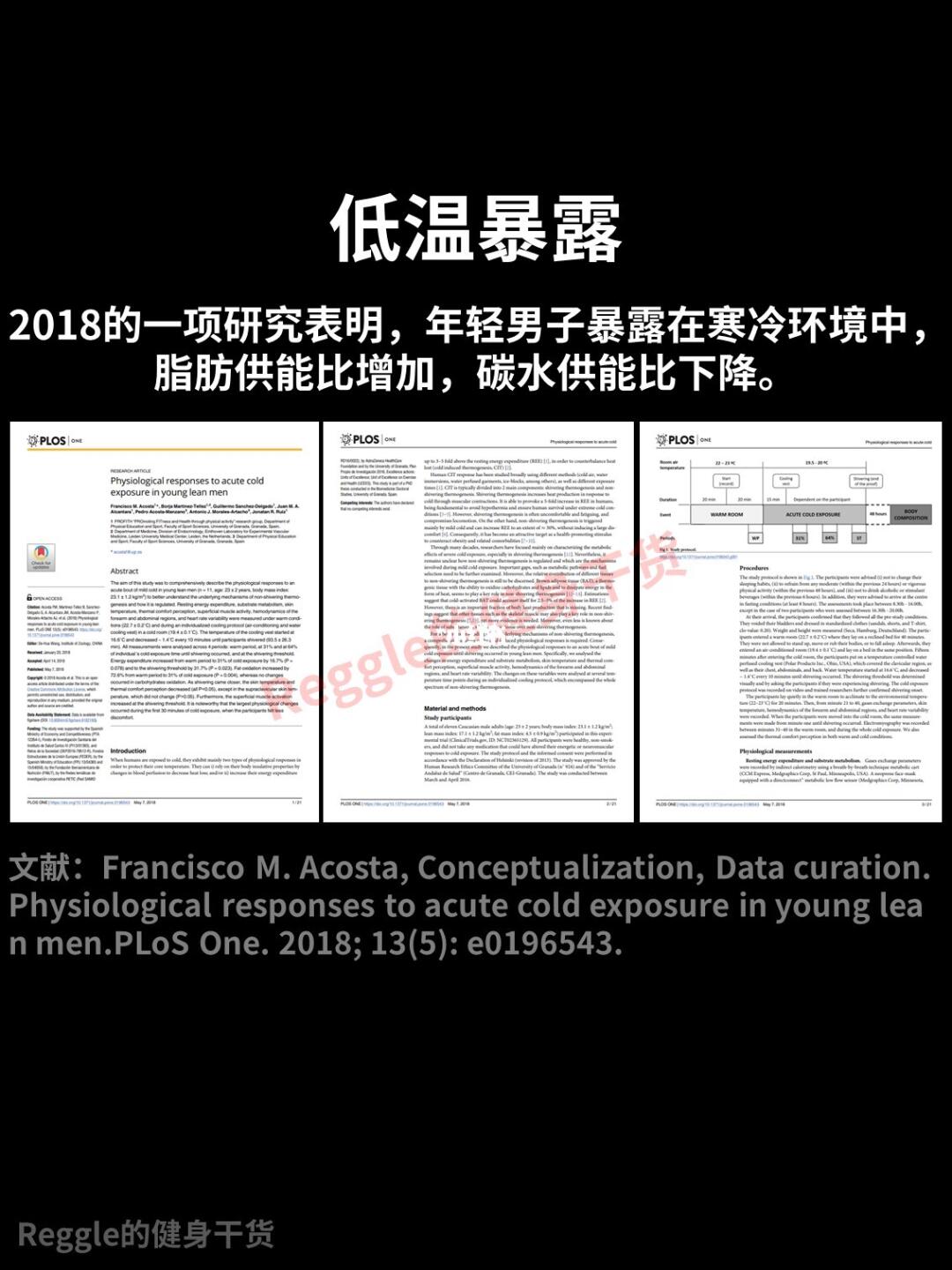 3. 2018的一项研究表明,年轻男子暴露在寒冷环境中,脂肪供能比增加,碳水供能比下降;但注意研究是短时间内的寒冷暴露,受试者穿的衣服很少,凉鞋、短裤,T恤。