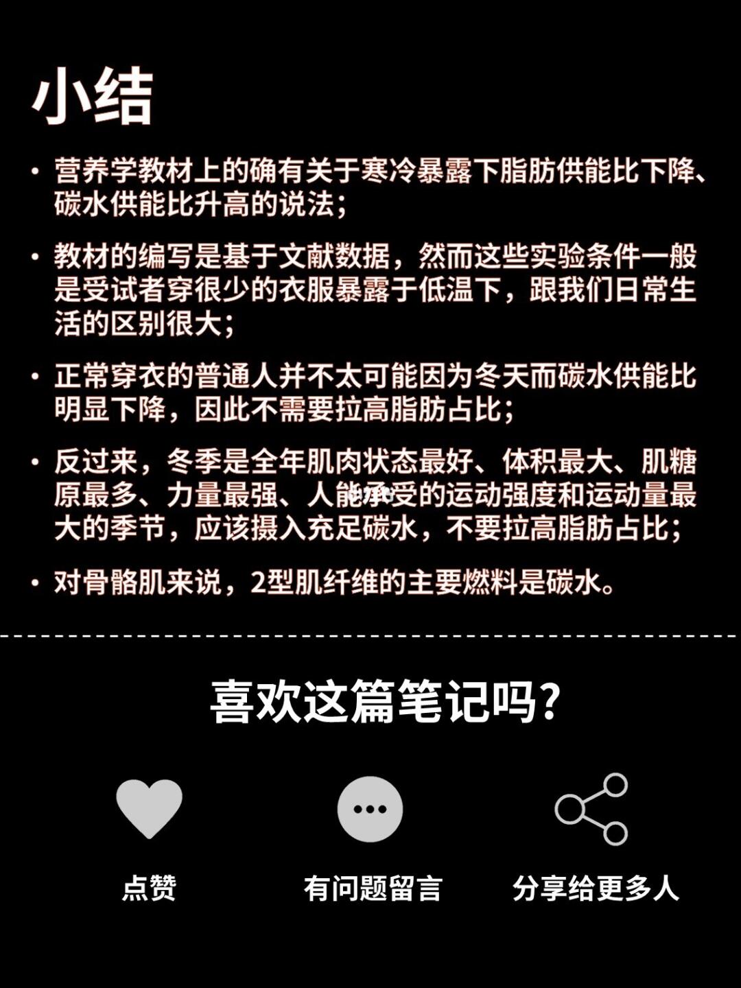 1. 近期不止一次有读者问我,冬天是不是应该减少碳水摄入,相应的拉高脂肪在总热量中的占比,因为他们听一些博主说人在冬天脂肪供能更活跃,碳水代谢不活跃,碳水吃多了消耗不了不利于健康。
