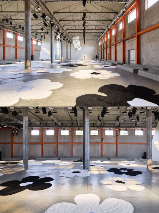由 OMA 操刀的秀场,空旷、极简,却在地面撒下 40 朵巨型人造毛皮花朵。部分地毯中心还用上了与成衣同款的浅蓝色府绸——是服装,也是地景。模特从暗门进入,从正门走向自然,打破建筑边界,把空间还给身体和风。