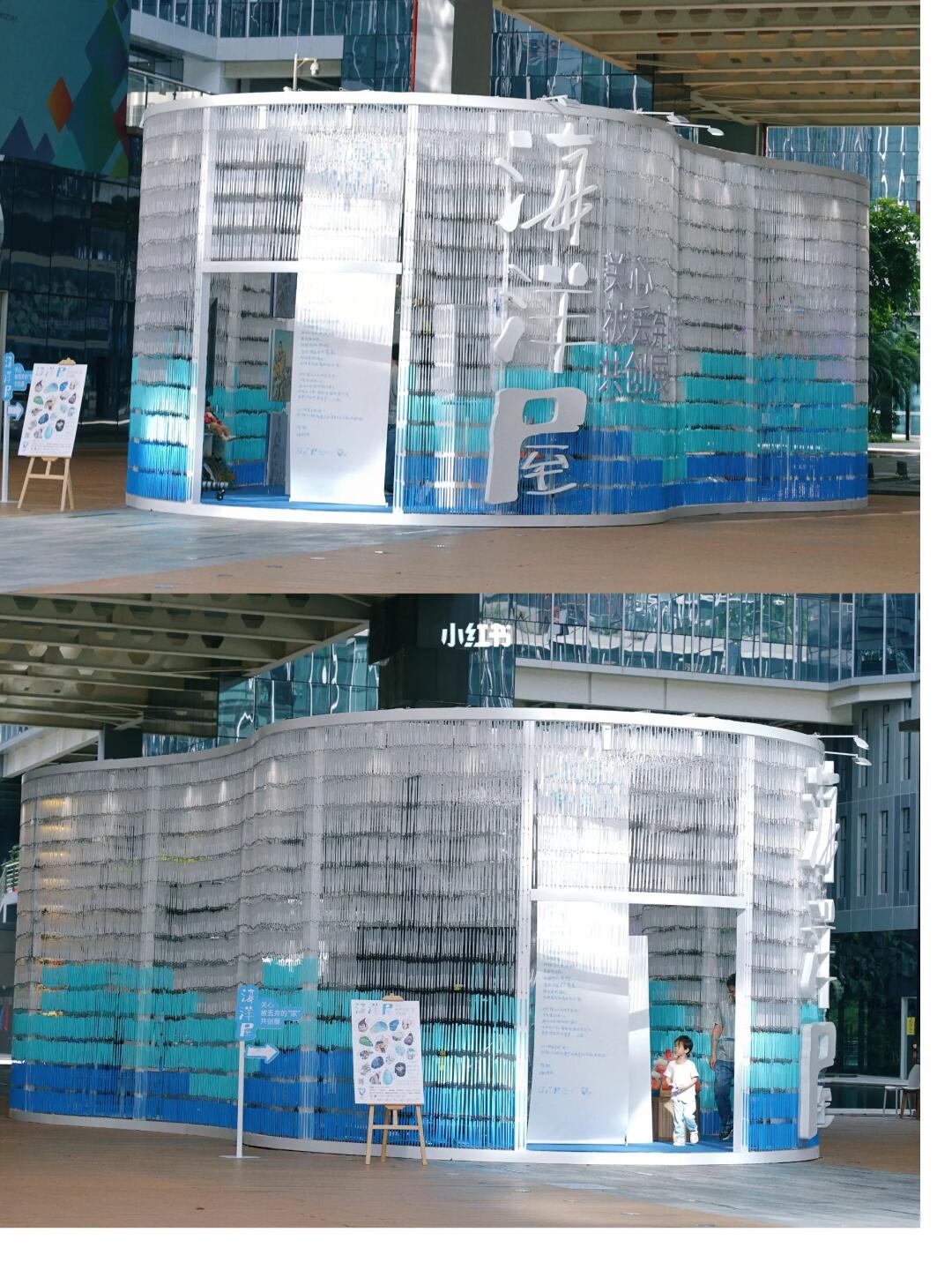 像回收塑料管制作成海洋屋的外墙,塑料瓶制作的沙滩椅,