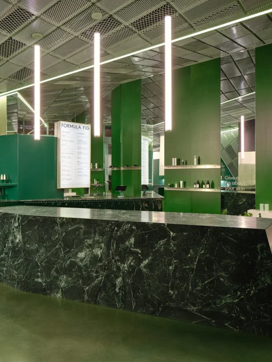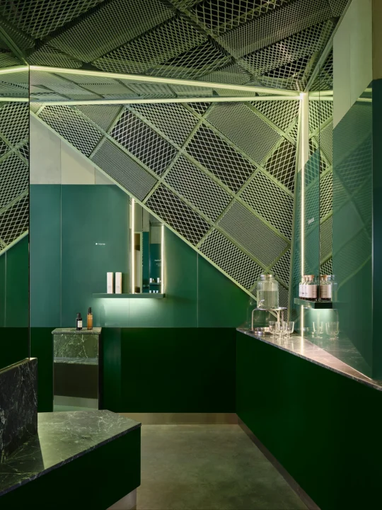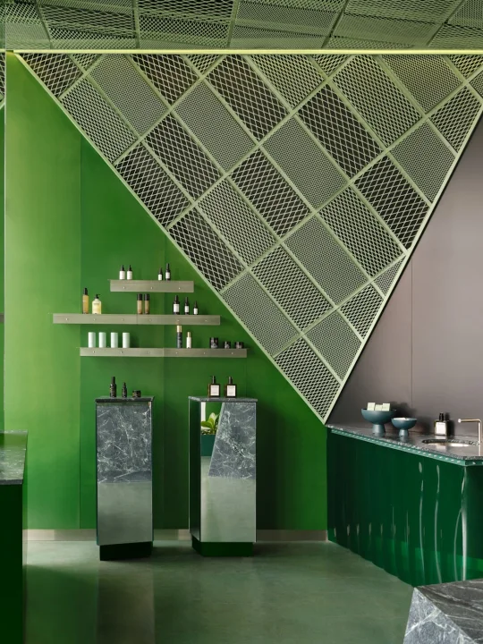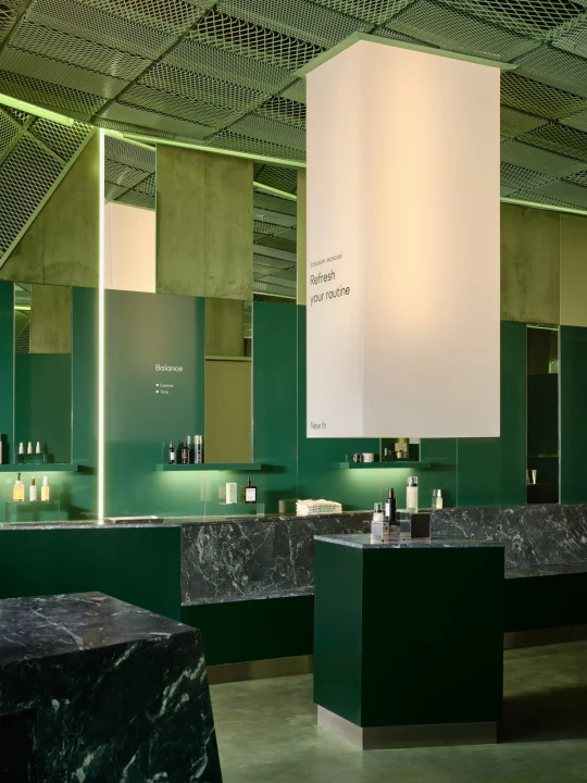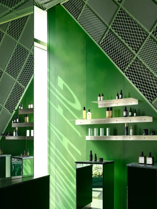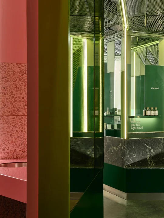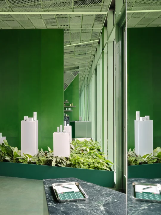这里的绿与粉,已经成为品牌标识,而设计师通过材质、光影和几何节奏,把护肤体验升级为沉浸式视觉之旅。