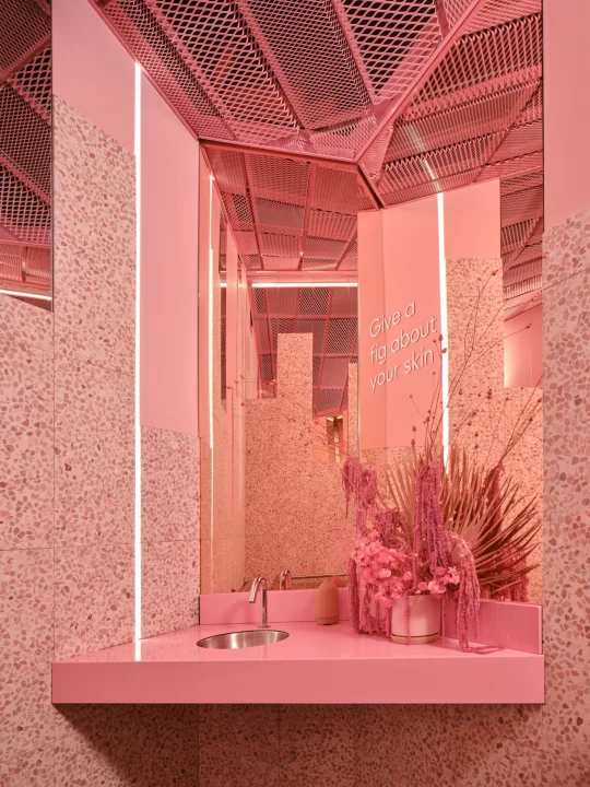 浴室的一抹粉色,为护理后的自拍提供了趣味舞台;空间刻意取消传统接待区,让访客自由探索。
