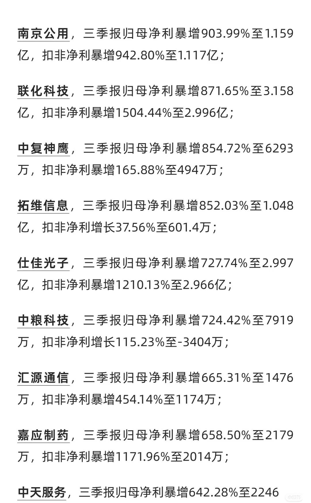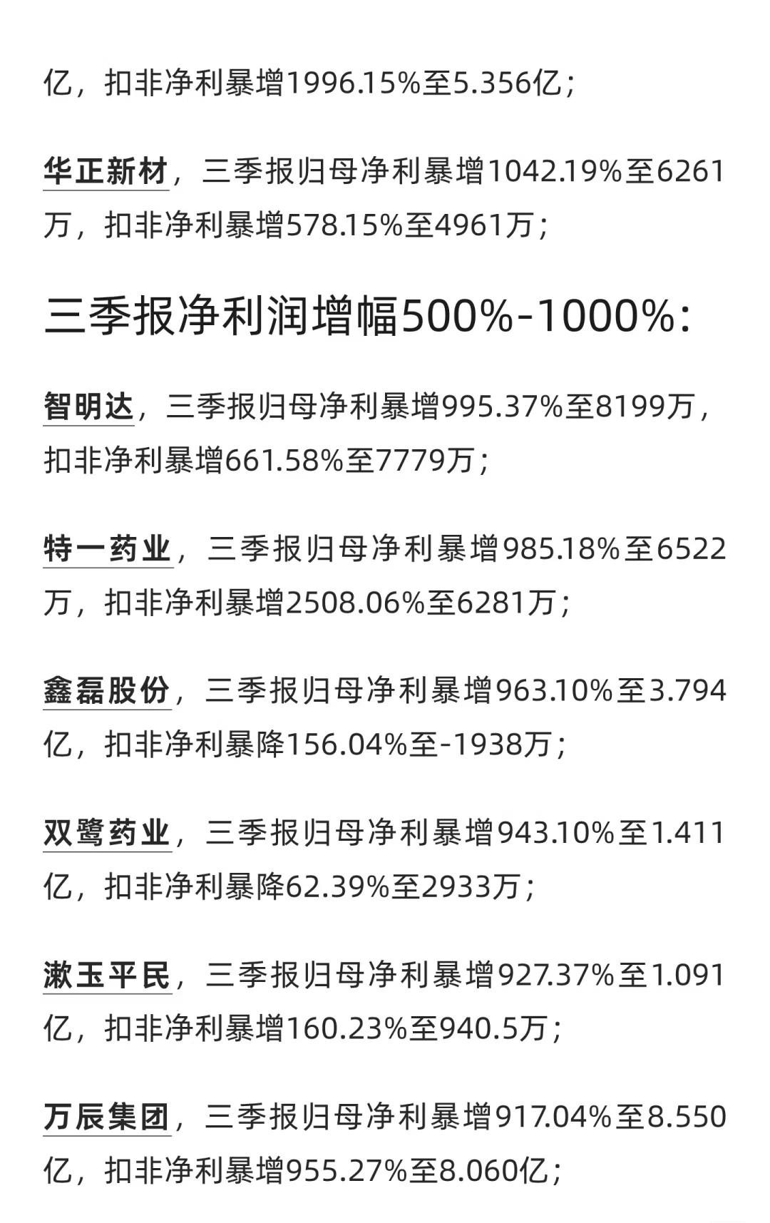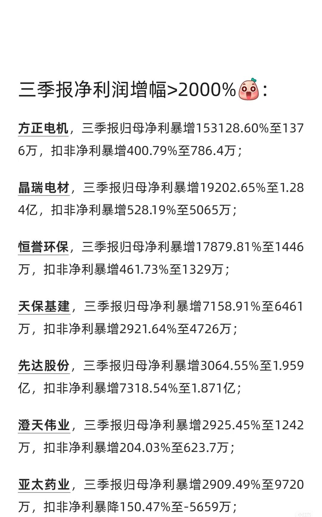 中国A股上市公司2025年第三季度(三季报)净利润同比大幅增长的财务信息,重点突出了多家公司净利润暴增的惊人幅度,具体内容整理如下: (一)净利润增幅超过 2000% 的公司 1. 方正电机 - 归母净利润同比暴增 153128.60%,达到 1376万元 - 扣非净利润同比暴增 400.79%,达到 786.4万元 2. 晶瑞电材 - 归母净利润同比暴增 19202.65%,至 1.284亿元 - 扣非净利润同比暴增 528.19%,至 5065万元 3. 恒誉环保 - 归母净利润同比暴增 17879.81%,至 1446万元 - 扣非净利润同比暴增 461.73%,至 1329万元 4. 天保基建 - 归母净利润同比暴增 7158.91%,至 6461万元 - 扣非净利润同比暴增 2921.64%,至 4726万元 5. 先达股份 - 归母净利润同比暴增 3064.55%,至 1.959亿元 - 扣非净利润同比暴增 7318.54%,至 1.871亿元 6. 澄天伟业 - 归母净利润同比暴增 2925.45%,至 1242万元 - 扣非净利润同比暴增 204.03%,至 623.7万元 7. 亚太药业 - 归母净利润同比暴增 2909.49%,至 9720万元 - 扣非净利润同比 下降150.47%,至 -5659万元 (二)净利润增幅 1000% ~ 2000% 区间 1. 深深房A:归母净利同比暴增 2791.57%,至 1.451亿元 2. 晓鸣股份:归母净利同比暴增 2243.97%,至 1.831亿元 3. 楚江新材:归母净利同比暴增 2089.49%,至 3.552亿元 4. 新强联:归母净利同比暴增 1939.50%,至 6.638亿元 5. 通化东宝:归母净利同比暴增 1911.35%,至 12.02亿元 6. 盛通股份:归母净利同比暴增 1818.07%,至 867.4万元 7. 金财互联:归母净利同比暴增 1697.84% 8. *ST松发:归母净利同比暴增 1614.08%,至 12.71亿元 9. 英联股份:归母净利同比暴增 1572.67%,至 3538万元 10. 苏利股份:归母净利同比暴增 1522.38%,至 1.392亿元 (三)净利润增幅 500% ~ 1000% 区间 1. 华正新材:归母净利同比暴增 1042.19%,至 6261万元 2. 智明达:归母净利同比暴增 995.37%,至 8199万元 3. 特一药业:归母净利同比暴增 985.18%,至 6522万元 4. 鑫磊股份:归母净利同比暴增 963.10%,至 3.794亿元 5. 万辰集团:归母净利同比暴增 917.04%,至 8.550亿元 6. 南京公用:归母净利同比暴增 903.99%,至 1.159亿元 7. 联化科技:归母净利同比暴增 871.65%,至 3.158亿元 8. 中复神鹰:归母净利同比暴增 854.72%,至 6293万元 9. 拓维信息:归母净利同比暴增 852.03%,至 1.048亿元 10. 仕佳光子:归母净利同比暴增 727.74%,至 2.997亿元 11. 中粮科技:归母净利同比暴增 724.42%,至 7919万元 12. 三友医疗:归母净利同比暴增 623.19%,至 6198万元 13. 臻镭科技:归母净利同比暴增 598.09%,至 1.010亿元 14. 合康新能:归母净利同比暴增 584.40%,至 7400万元 15. 神通科技:归母净利同比暴增 584.07%,至 1.133亿元 16. 华丰科技:归母净利同比暴增 558.51%,至 2.231亿元 17. 国轩高科:归母净利同比暴增 514.35%,金额未完全显示 18. 北化股份:归母净利同比暴增 504.80%,至 1.884亿元 19. ST西发:归母净利同比暴增 503.98%,至 1.449亿元 20. *ST宝实:归母净利同比暴增 501.36%,至 1.178亿元