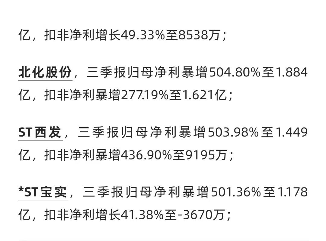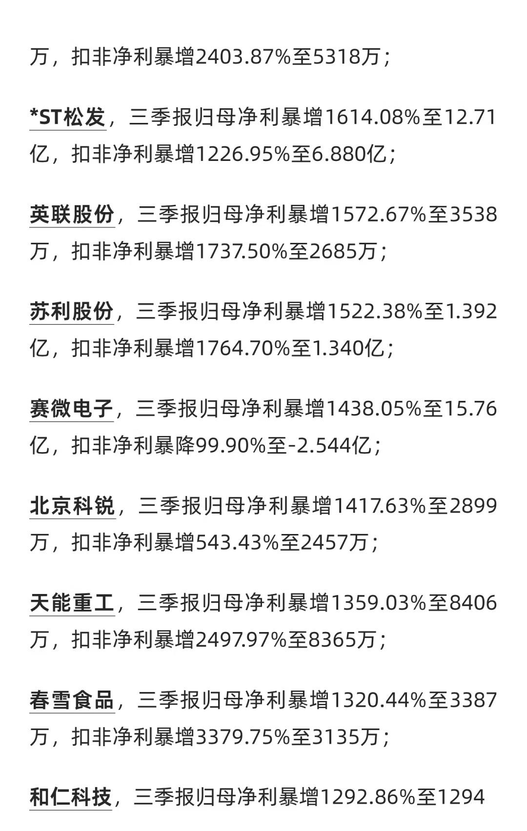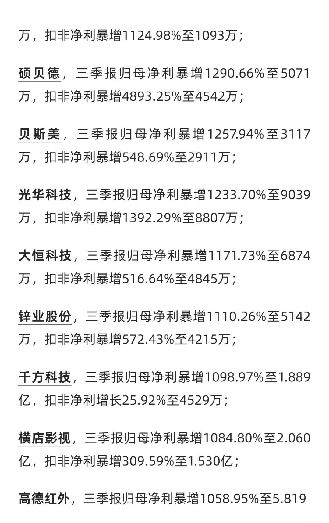 中国A股上市公司2025年第三季度(三季报)净利润同比大幅增长的财务信息,重点突出了多家公司净利润暴增的惊人幅度,具体内容整理如下: (一)净利润增幅超过 2000% 的公司 1. 方正电机 - 归母净利润同比暴增 153128.60%,达到 1376万元 - 扣非净利润同比暴增 400.79%,达到 786.4万元 2. 晶瑞电材 - 归母净利润同比暴增 19202.65%,至 1.284亿元 - 扣非净利润同比暴增 528.19%,至 5065万元 3. 恒誉环保 - 归母净利润同比暴增 17879.81%,至 1446万元 - 扣非净利润同比暴增 461.73%,至 1329万元 4. 天保基建 - 归母净利润同比暴增 7158.91%,至 6461万元 - 扣非净利润同比暴增 2921.64%,至 4726万元 5. 先达股份 - 归母净利润同比暴增 3064.55%,至 1.959亿元 - 扣非净利润同比暴增 7318.54%,至 1.871亿元 6. 澄天伟业 - 归母净利润同比暴增 2925.45%,至 1242万元 - 扣非净利润同比暴增 204.03%,至 623.7万元 7. 亚太药业 - 归母净利润同比暴增 2909.49%,至 9720万元 - 扣非净利润同比 下降150.47%,至 -5659万元 (二)净利润增幅 1000% ~ 2000% 区间 1. 深深房A:归母净利同比暴增 2791.57%,至 1.451亿元 2. 晓鸣股份:归母净利同比暴增 2243.97%,至 1.831亿元 3. 楚江新材:归母净利同比暴增 2089.49%,至 3.552亿元 4. 新强联:归母净利同比暴增 1939.50%,至 6.638亿元 5. 通化东宝:归母净利同比暴增 1911.35%,至 12.02亿元 6. 盛通股份:归母净利同比暴增 1818.07%,至 867.4万元 7. 金财互联:归母净利同比暴增 1697.84% 8. *ST松发:归母净利同比暴增 1614.08%,至 12.71亿元 9. 英联股份:归母净利同比暴增 1572.67%,至 3538万元 10. 苏利股份:归母净利同比暴增 1522.38%,至 1.392亿元 (三)净利润增幅 500% ~ 1000% 区间 1. 华正新材:归母净利同比暴增 1042.19%,至 6261万元 2. 智明达:归母净利同比暴增 995.37%,至 8199万元 3. 特一药业:归母净利同比暴增 985.18%,至 6522万元 4. 鑫磊股份:归母净利同比暴增 963.10%,至 3.794亿元 5. 万辰集团:归母净利同比暴增 917.04%,至 8.550亿元 6. 南京公用:归母净利同比暴增 903.99%,至 1.159亿元 7. 联化科技:归母净利同比暴增 871.65%,至 3.158亿元 8. 中复神鹰:归母净利同比暴增 854.72%,至 6293万元 9. 拓维信息:归母净利同比暴增 852.03%,至 1.048亿元 10. 仕佳光子:归母净利同比暴增 727.74%,至 2.997亿元 11. 中粮科技:归母净利同比暴增 724.42%,至 7919万元 12. 三友医疗:归母净利同比暴增 623.19%,至 6198万元 13. 臻镭科技:归母净利同比暴增 598.09%,至 1.010亿元 14. 合康新能:归母净利同比暴增 584.40%,至 7400万元 15. 神通科技:归母净利同比暴增 584.07%,至 1.133亿元 16. 华丰科技:归母净利同比暴增 558.51%,至 2.231亿元 17. 国轩高科:归母净利同比暴增 514.35%,金额未完全显示 18. 北化股份:归母净利同比暴增 504.80%,至 1.884亿元 19. ST西发:归母净利同比暴增 503.98%,至 1.449亿元 20. *ST宝实:归母净利同比暴增 501.36%,至 1.178亿元