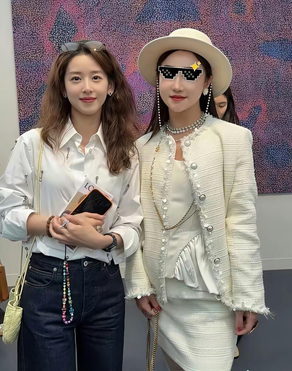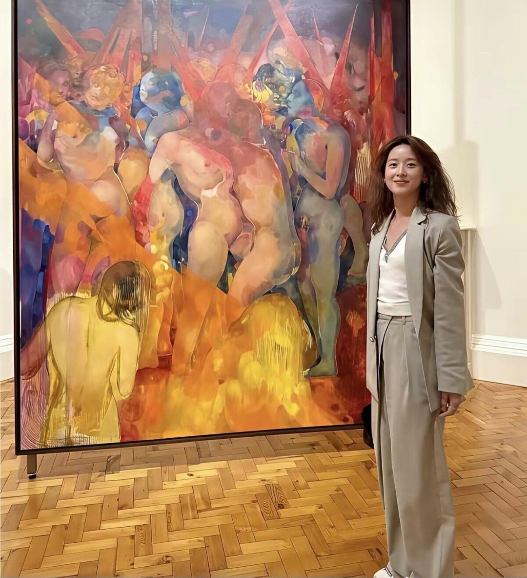 章泽天烫着黄色大卷,跟艺术画合影,这和以前的她大相径庭
