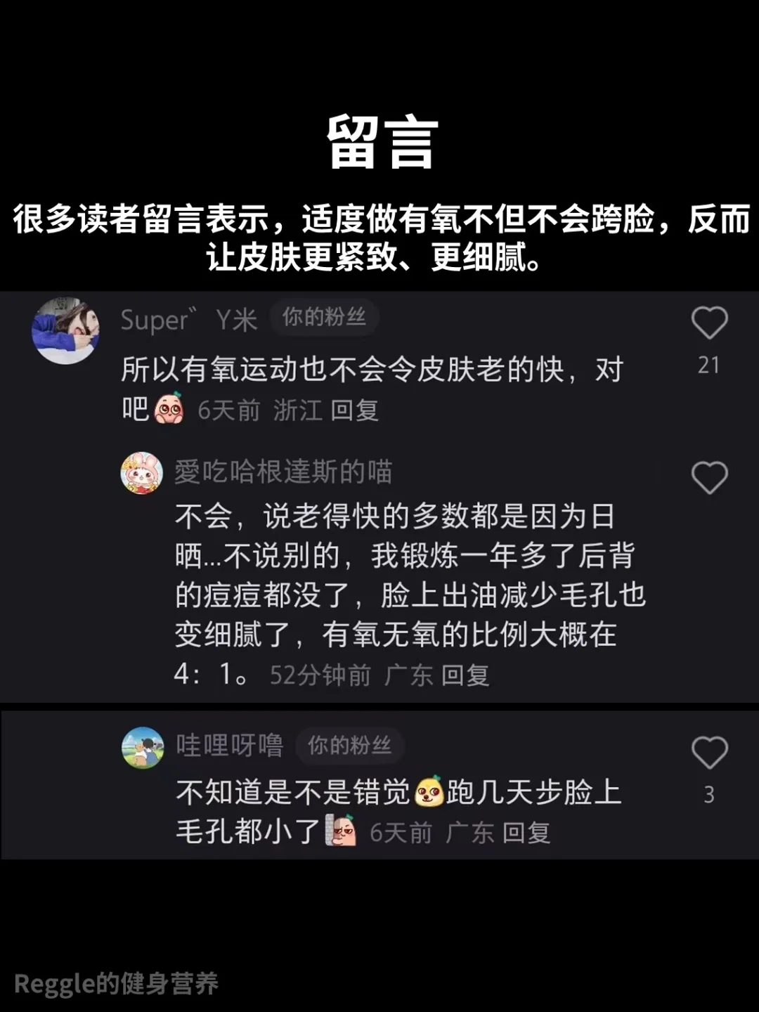 皮肤 皮肤管理 好皮肤 减脂 减脂我是认真的 减肥 减肥减脂吃这些 减肥食谱分享 减肥一天吃什么 减肥动力 减肥日记 减肥日常 又该减肥了 小基数减肥 大基数减肥 减肥经验分享 已经证明,有氧运动既不会跨脸,也不会导致肌肉流失。 健身行业之所以有这么多谣言,部分是因为知识局限,可能也有利益驱动:有氧运动是简单易行的方式,不易买课。