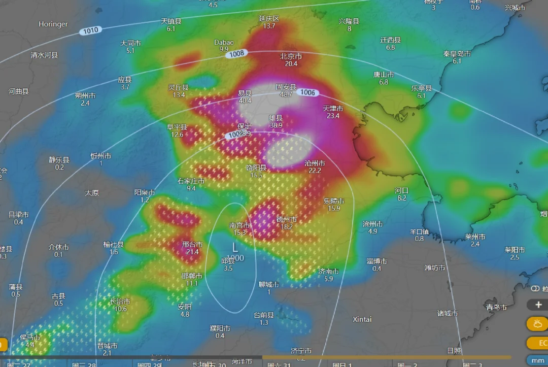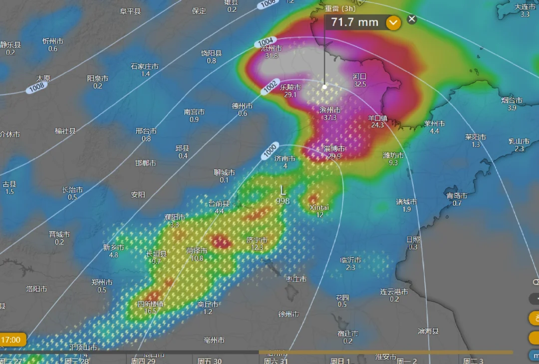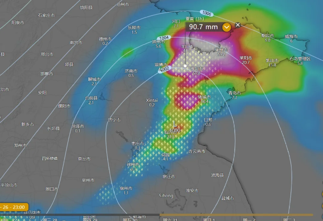 根据预报,聊城、德州、滨州、东营、济南、泰安、淄博、潍坊、日照、临沂北部、青岛和烟台有大到暴雨局部大暴雨并伴有雷电(40~70毫米,局部150~200毫米),最大1小时降水量50~80毫米;其他地区有大雨局部暴雨(20~30毫米,局部50~80毫米)。全省累积平均降水量40~60毫米。
