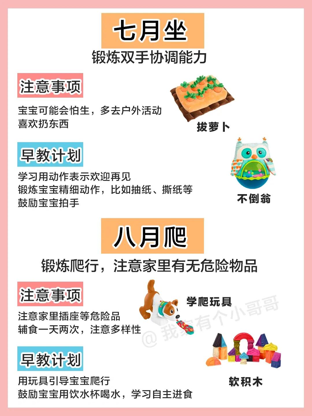 🔸早教计划:引导宝宝主动抓握、练习拉坐,慢慢训练独坐。