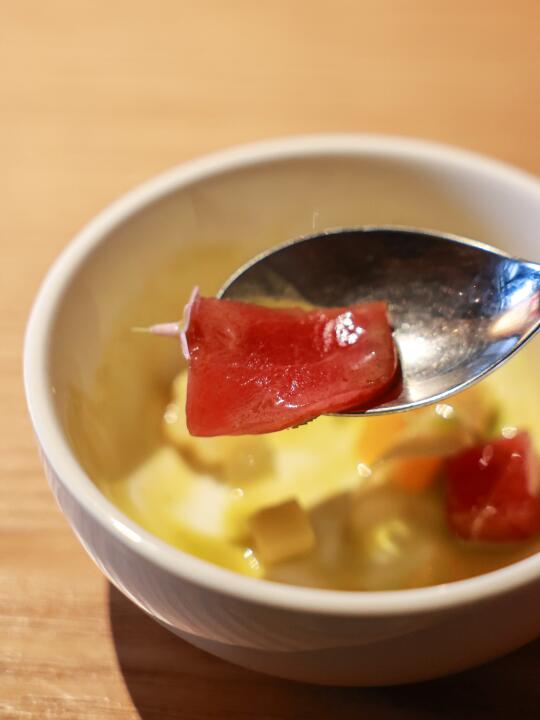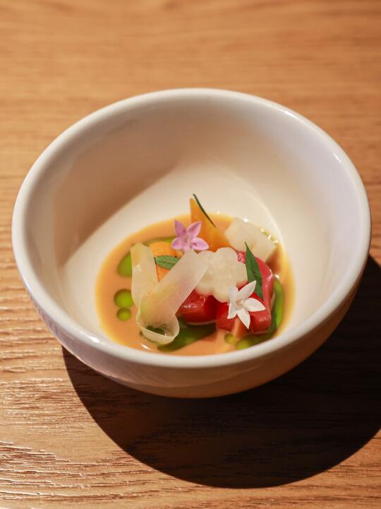 这道’看似简易’的捞起,搅匀之后的风味复杂多样,主调以酸为主,慢慢带出吞拿鱼的鲜味;然后藏有南瓜的绵密、番木瓜的丝滑;zui后口腔里还保留的一些坚果香气,让所有食材风味交在一起,挺好吃挺开胃,也挺少的🤣